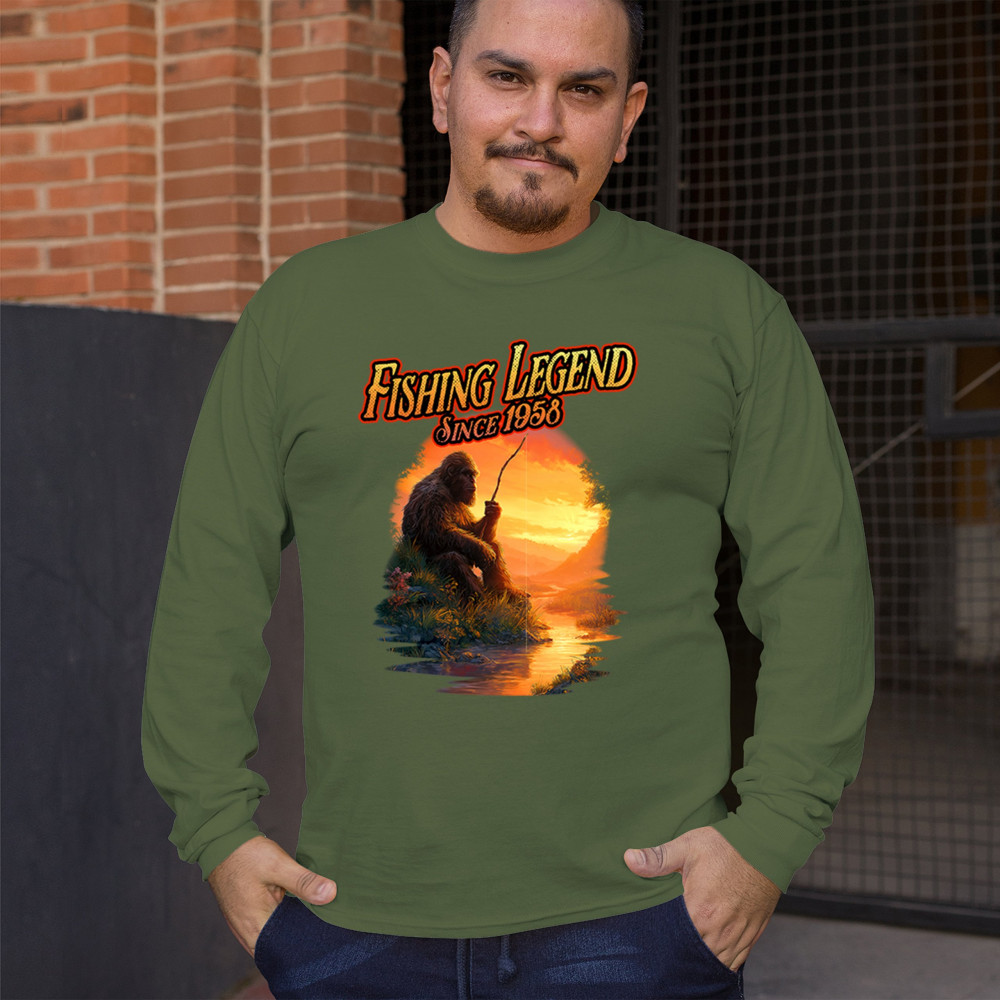 Bigfoot fishing legend design with Sasquatch lifestyle, retro vintage humor, funny wilderness shirt, Father’s Day gift, and campfire style.