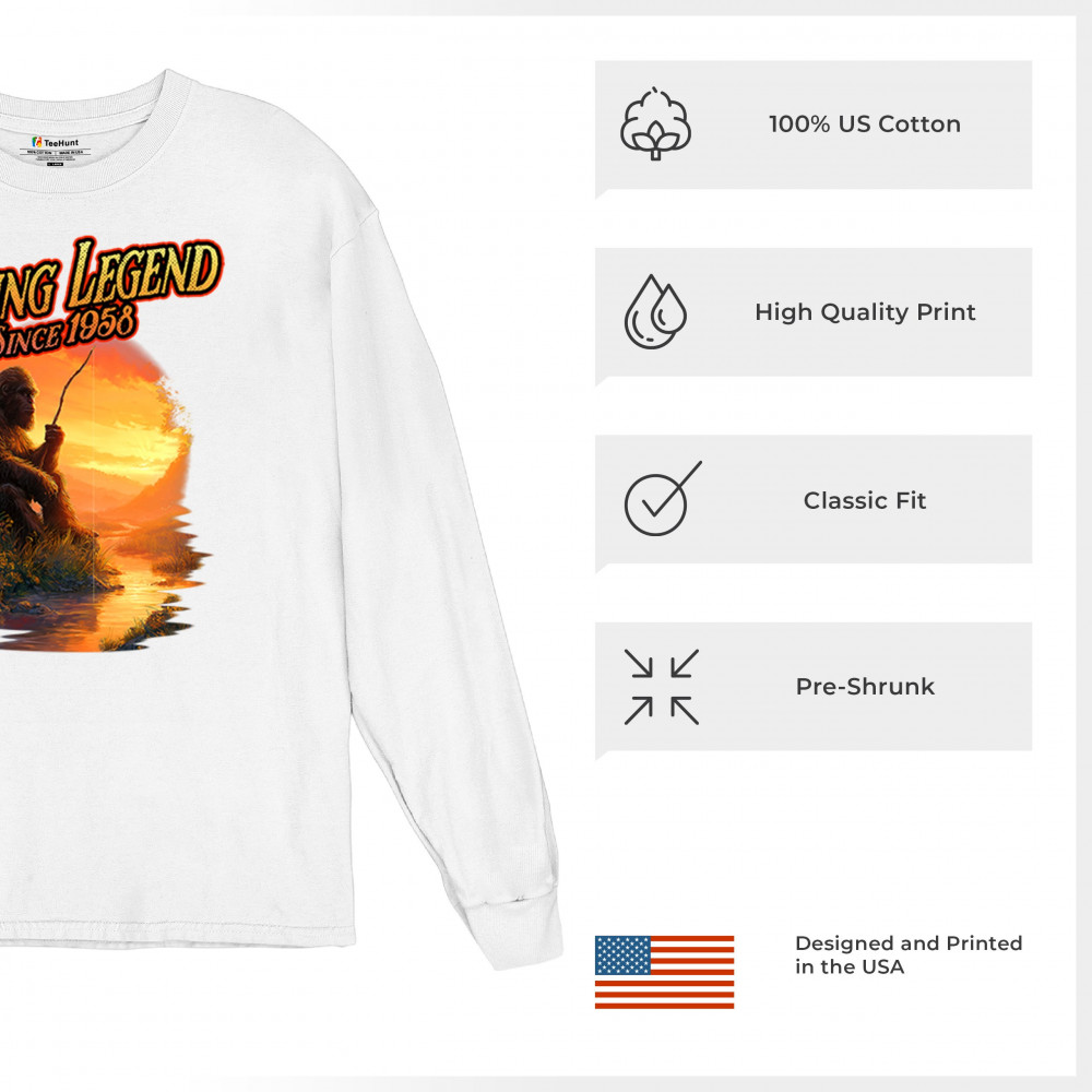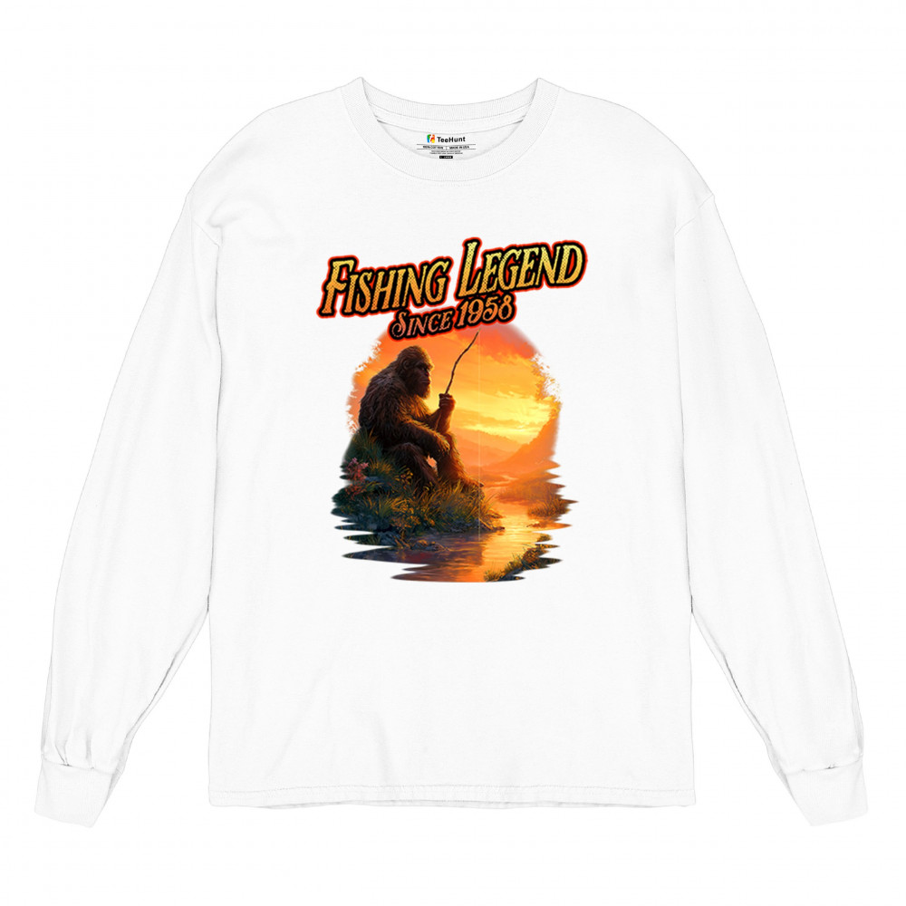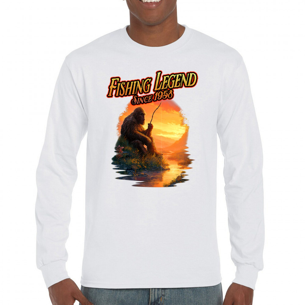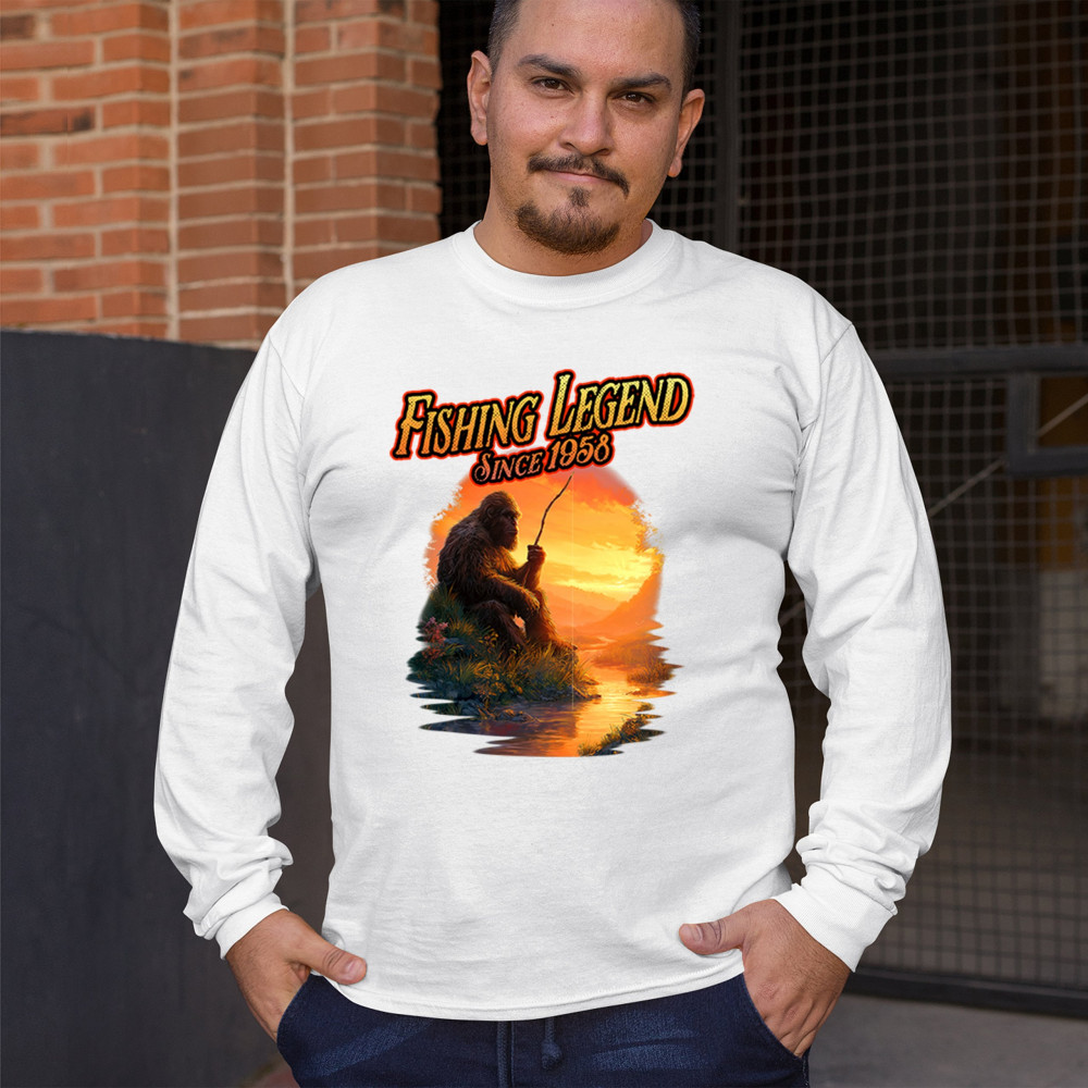 Bigfoot fishing legend design with Sasquatch lifestyle, retro vintage humor, funny wilderness shirt, Father’s Day gift, and campfire style.