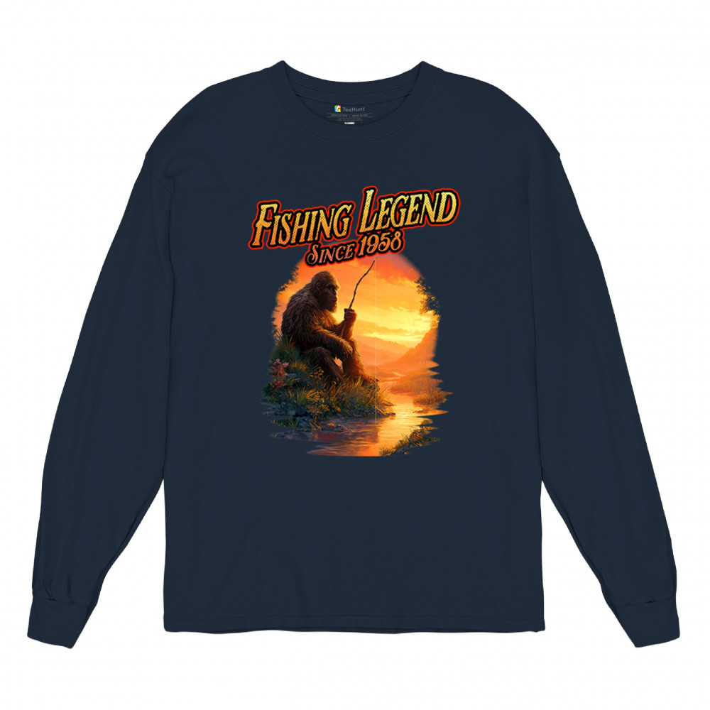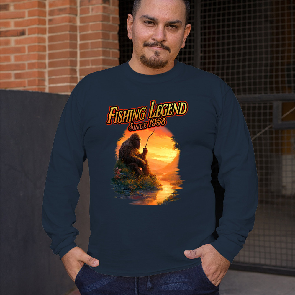 Bigfoot fishing legend design with Sasquatch lifestyle, retro vintage humor, funny wilderness shirt, Father’s Day gift, and campfire style.