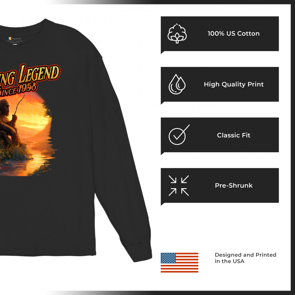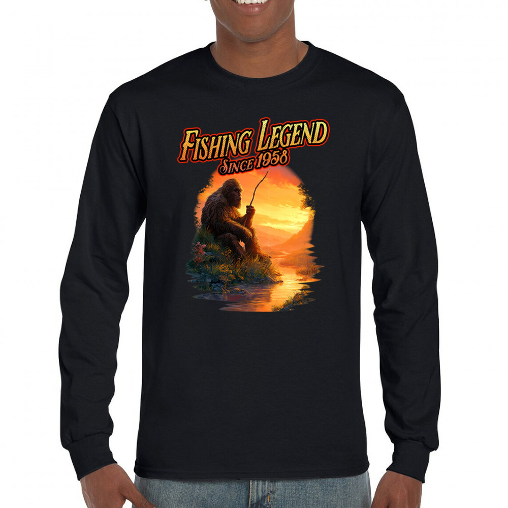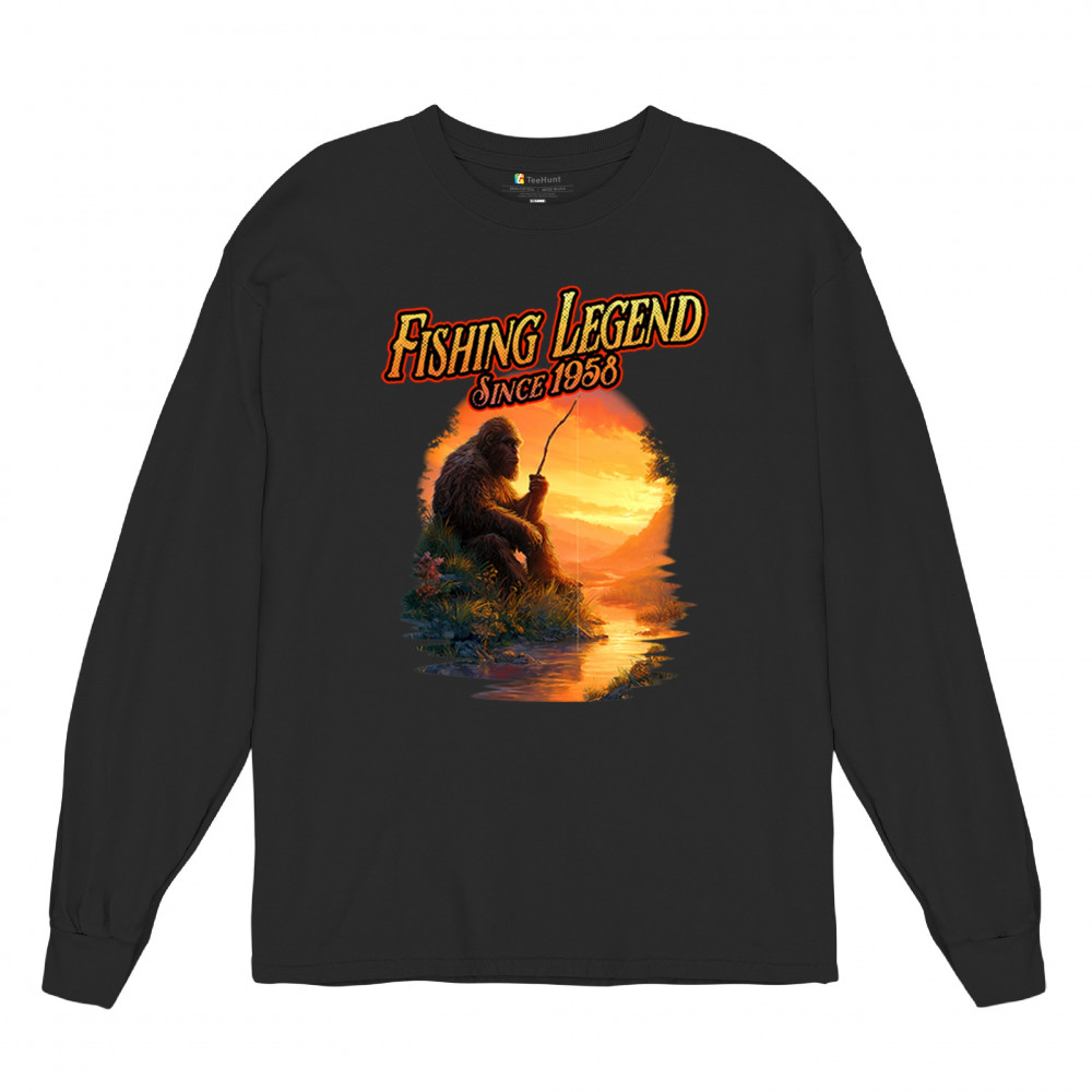 Bigfoot fishing legend design with Sasquatch lifestyle, retro vintage humor, funny wilderness shirt, Father’s Day gift, and campfire style.