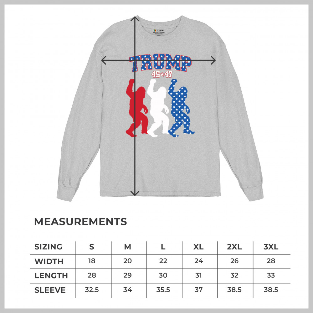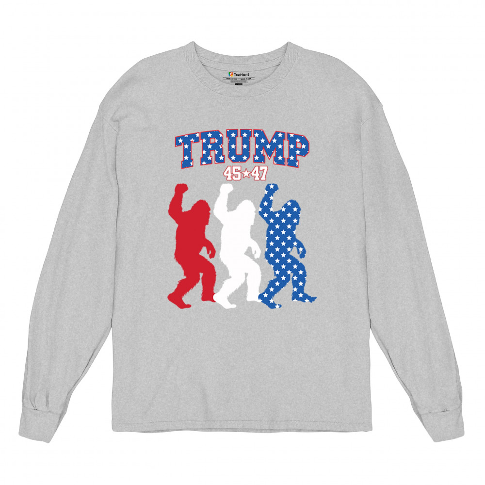 Unite humor and patriotism with the Trump 45/47 Bigfoot design! Featuring bold red, white, and blue Bigfoot silhouettes adorned with American flag stars, this eye-catching design supports Donald J. Trump, the Republican party, and the Red Wave movement. Embrace the fight for common sense, America First, and the people's mandate with this unique and fun statement piece.