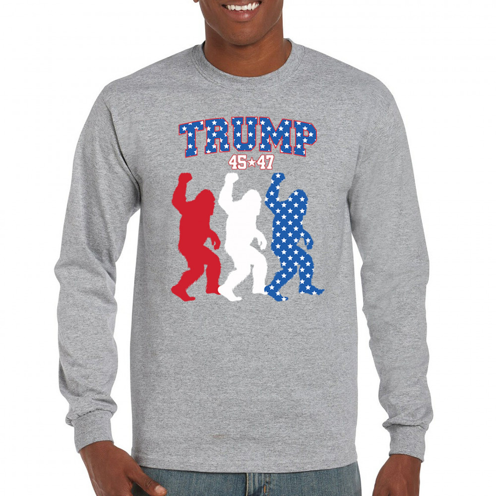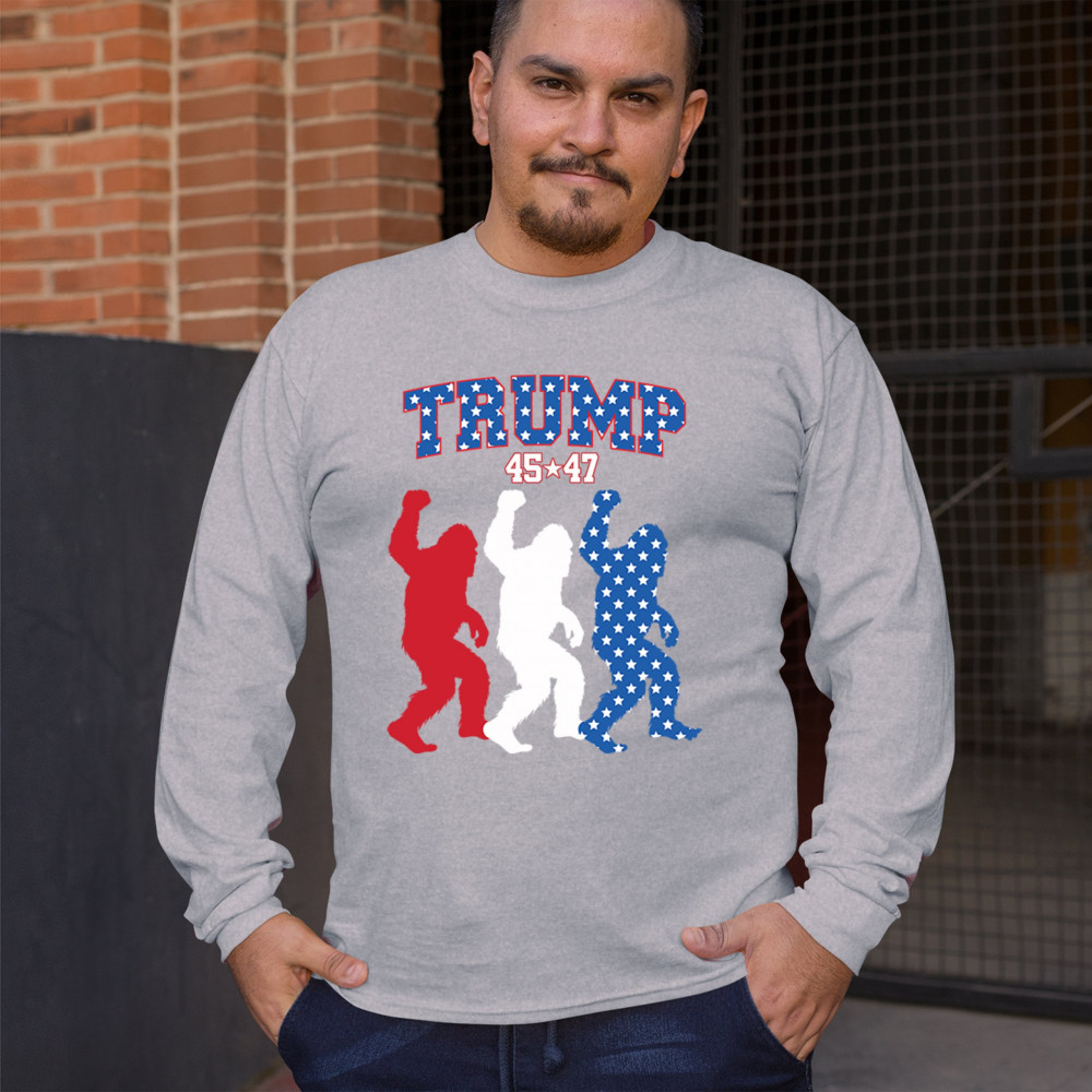 Trump 45/47 Bigfoot design in red, white, and blue with American flag stars. Celebrate patriotism, humor, and the fight for America First values.