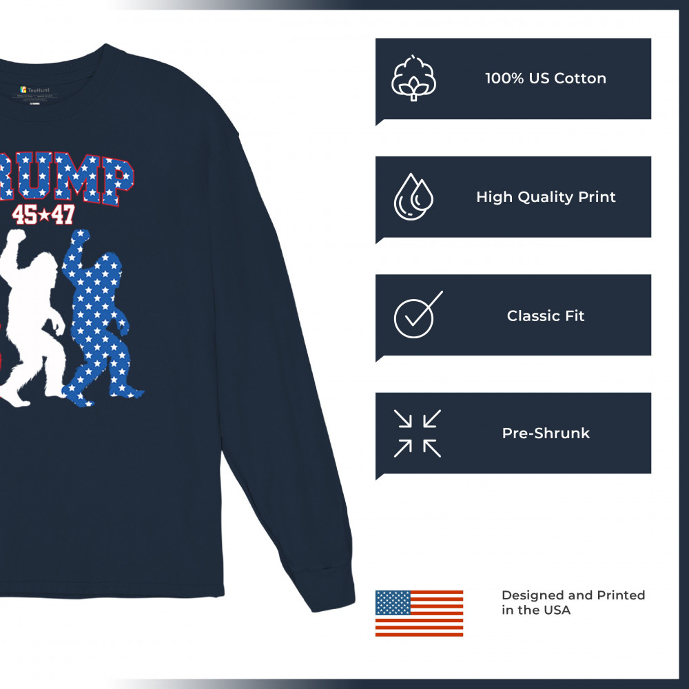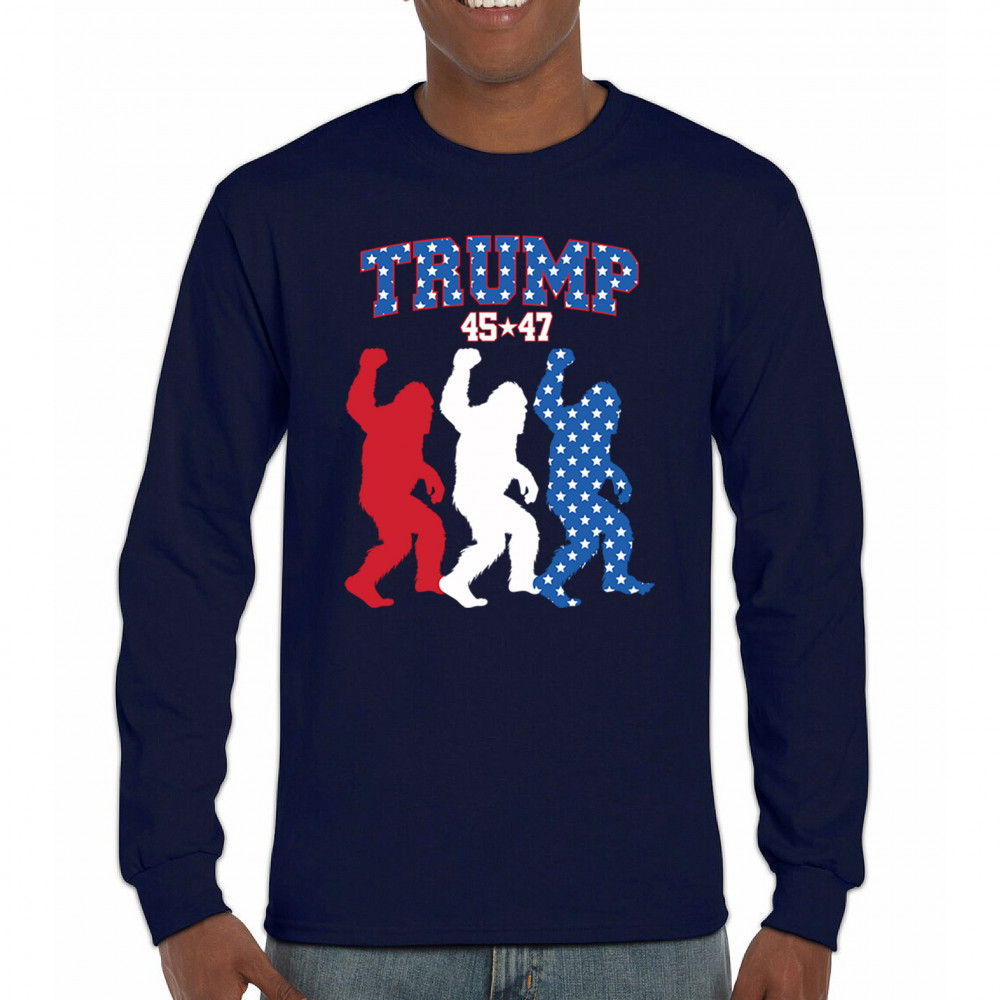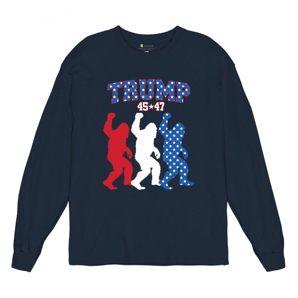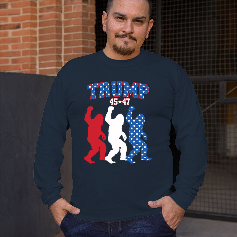 Trump 45/47 Bigfoot design in red, white, and blue with American flag stars. Celebrate patriotism, humor, and the fight for America First values.