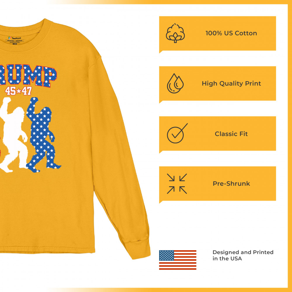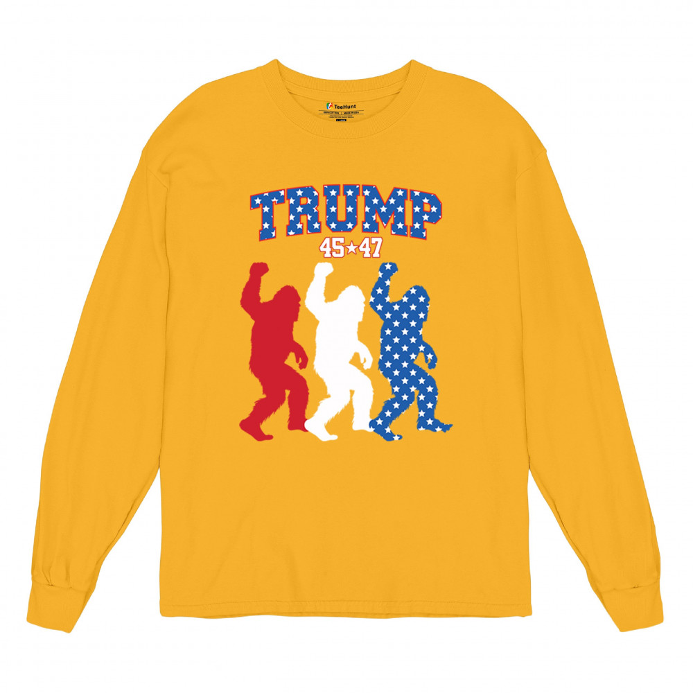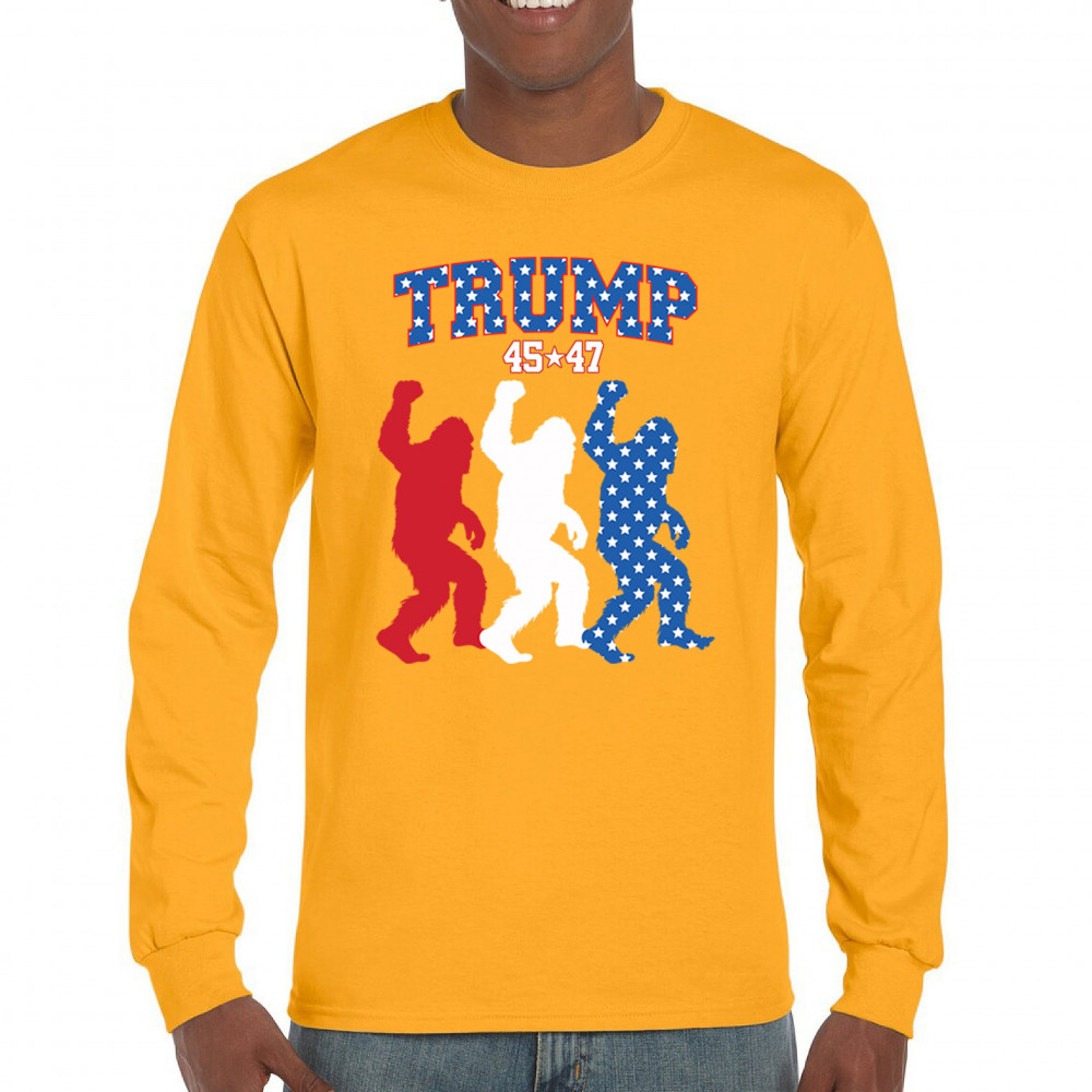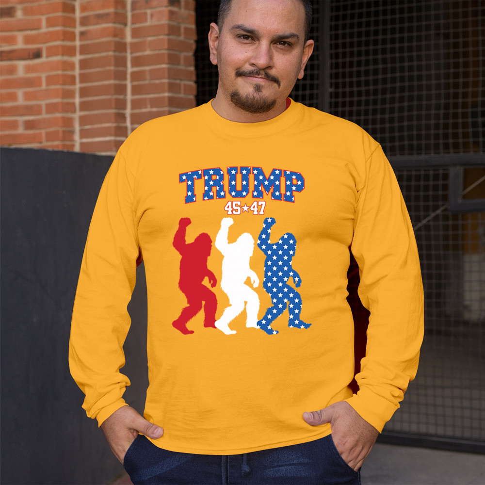 Trump 45/47 Bigfoot design in red, white, and blue with American flag stars. Celebrate patriotism, humor, and the fight for America First values.