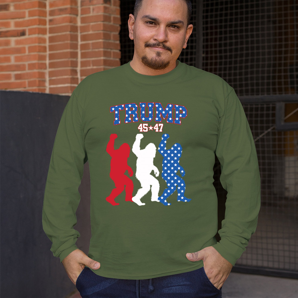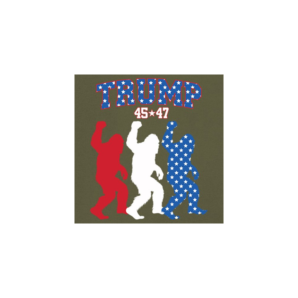 Trump 45/47 Bigfoot design in red, white, and blue with American flag stars. Celebrate patriotism, humor, and the fight for America First values.