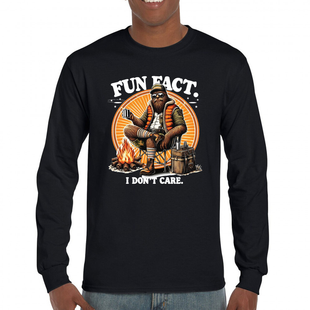 Funny Bigfoot Fun Fact design with cryptid humor, sarcastic outdoors shirt vibe, retro Sasquatch saying, USA pride, and camping adventure style.