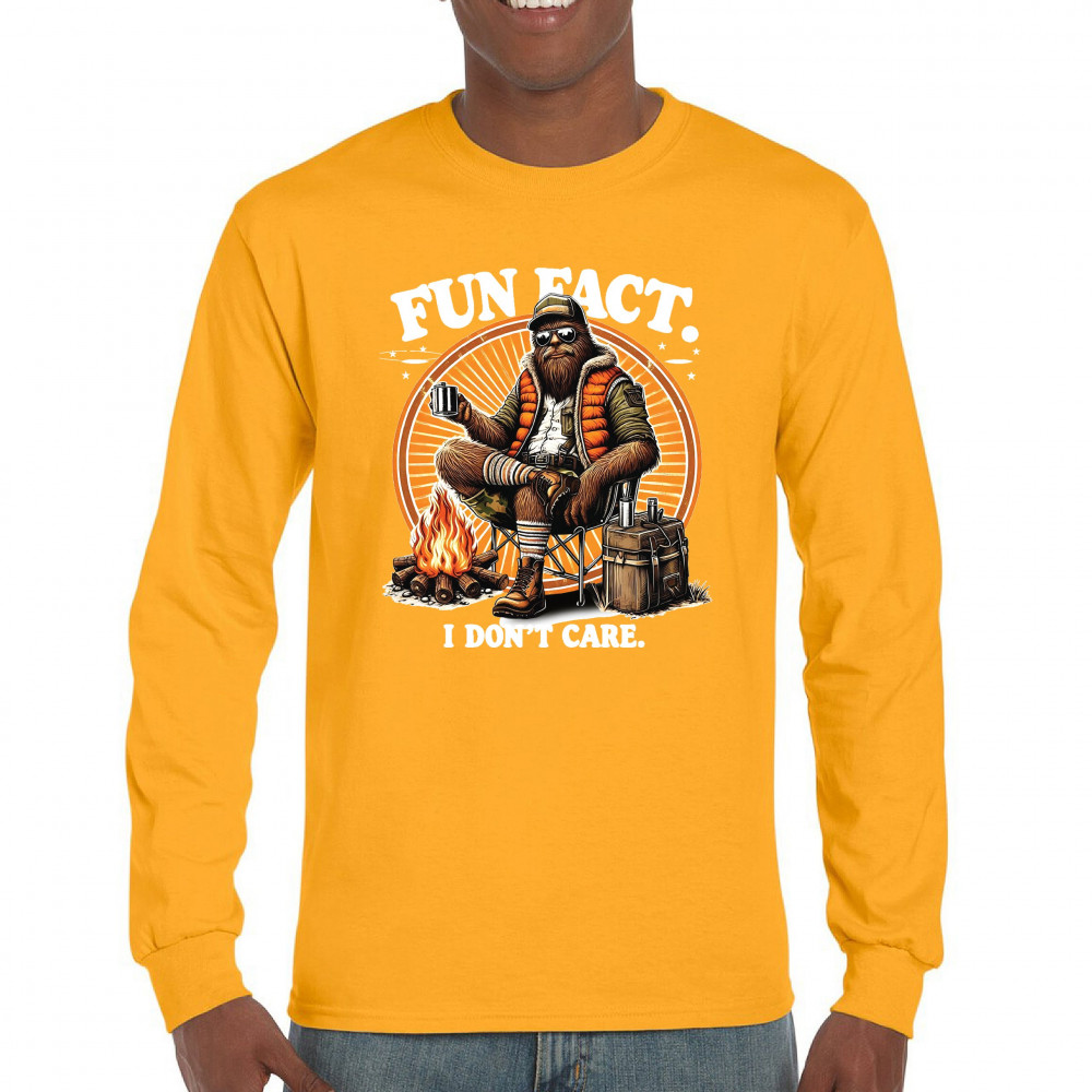 Funny Bigfoot Fun Fact design with cryptid humor, sarcastic outdoors shirt vibe, retro Sasquatch saying, USA pride, and camping adventure style.