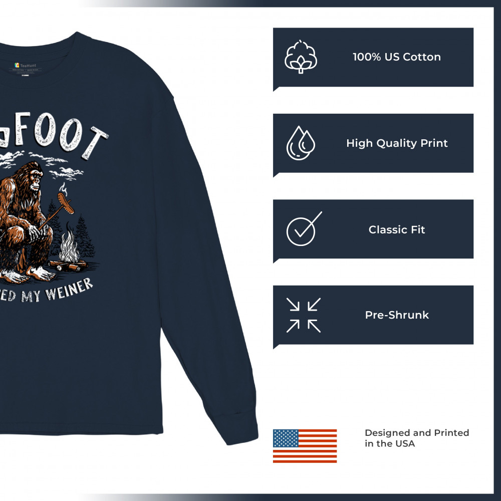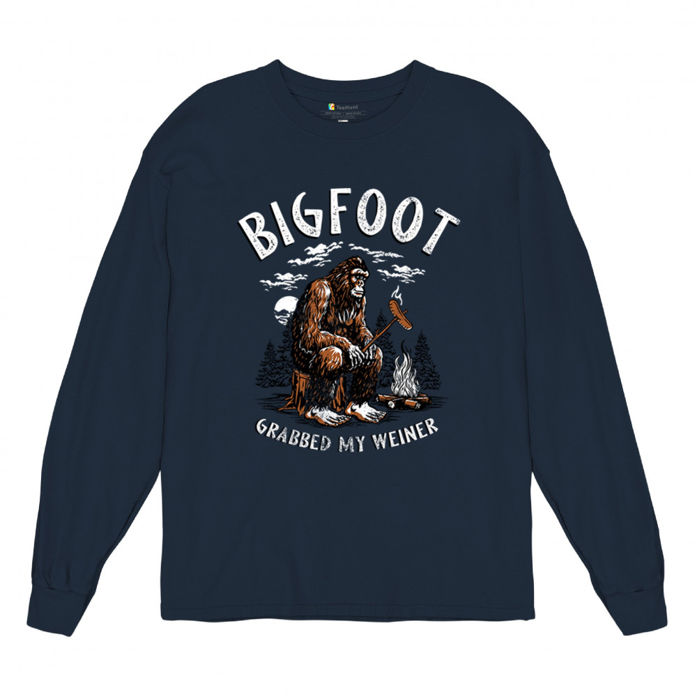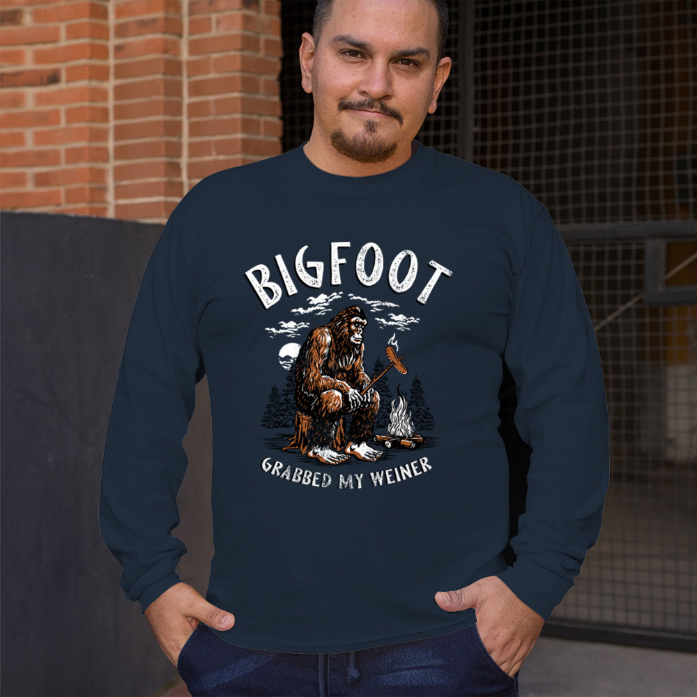 The Bigfoot Grabbed My Weiner design brings cheeky campfire humor to your outdoor adventures. Featuring a cartoon-style Sasquatch roasting a sausage by the fire, it’s perfect for cryptid lovers, campers, and jokesters. Ideal for BBQs, bonfires, forest festivals, and anyone who enjoys weiner jokes with their wilderness.