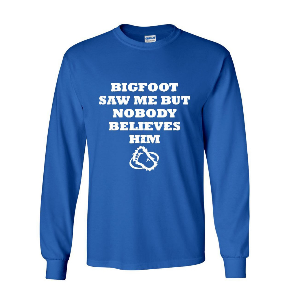 BIGFOOT SAW ME BUT NOBODY BELIEVES HIM long sleeve t-shirt funny royal blue