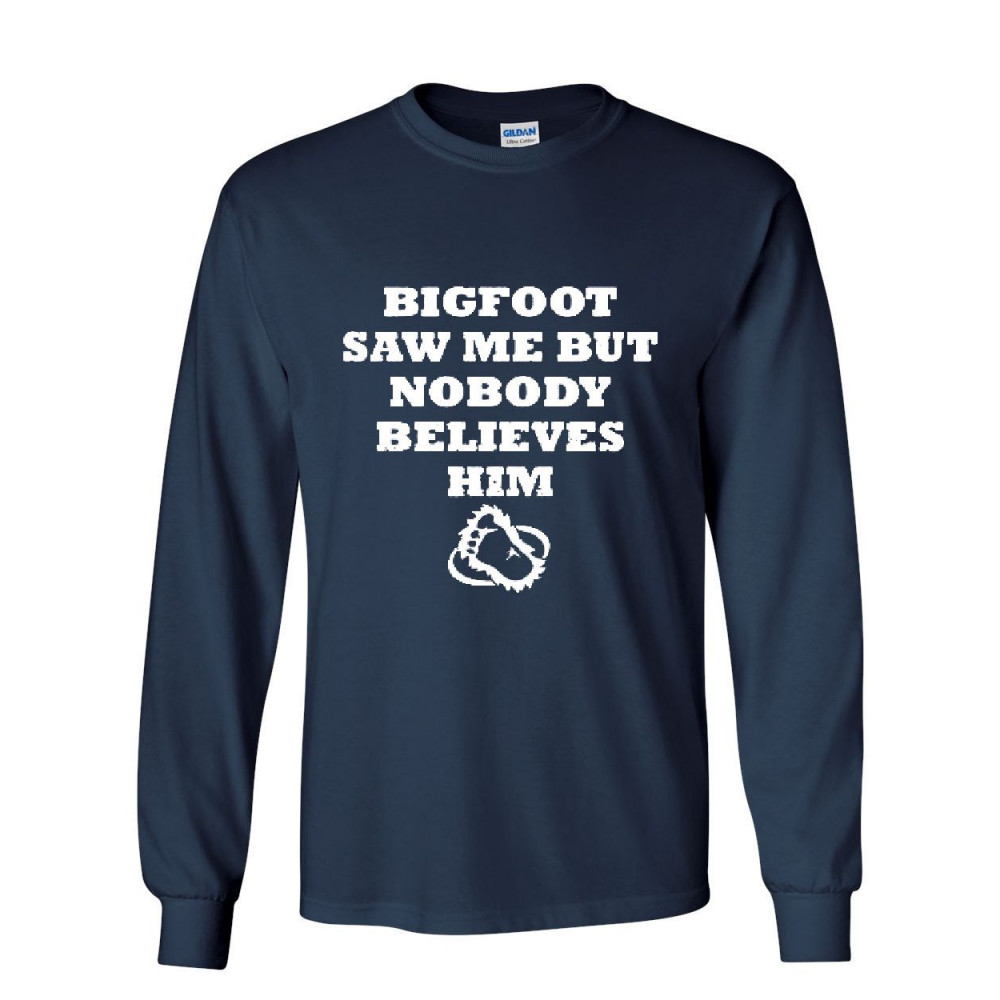 BIGFOOT SAW ME BUT NOBODY BELIEVES HIM long sleeve t-shirt funny navy blue