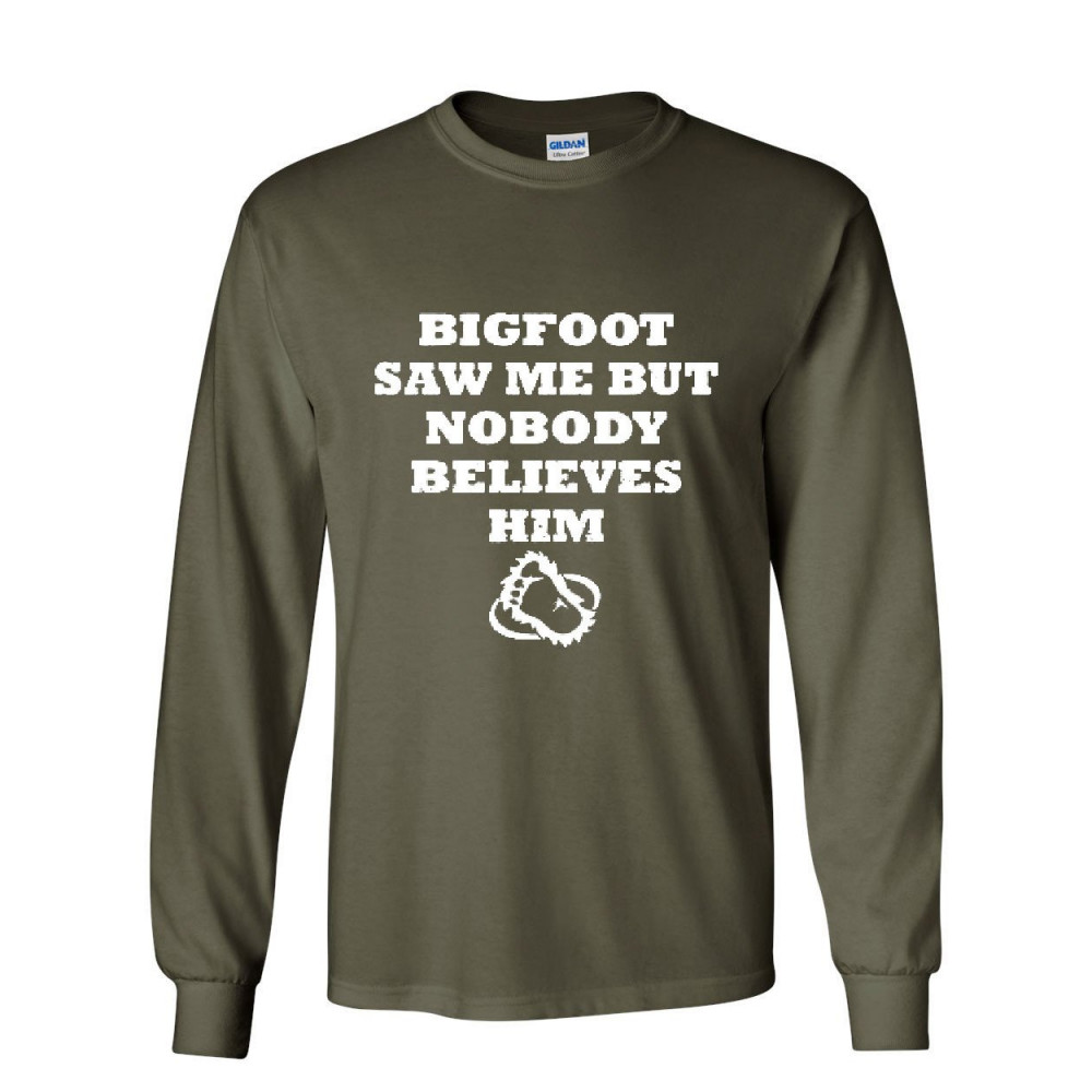 BIGFOOT SAW ME BUT NOBODY BELIEVES HIM long sleeve t-shirt funny military green