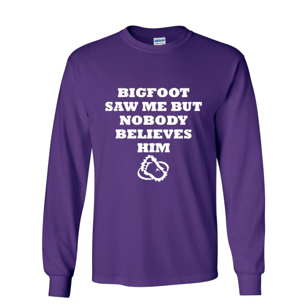 BIGFOOT SAW ME BUT NOBODY BELIEVES HIM long sleeve t-shirt funny purple