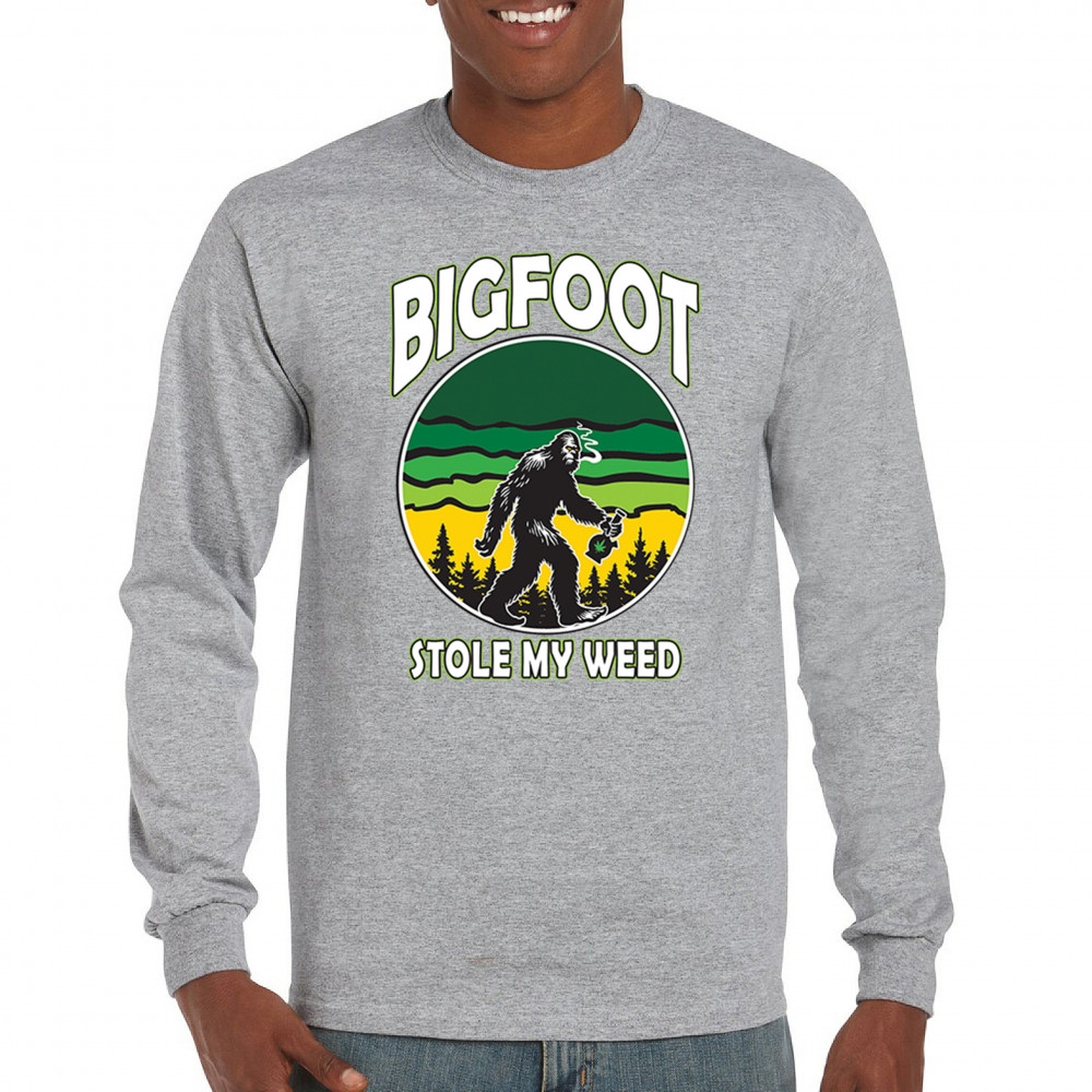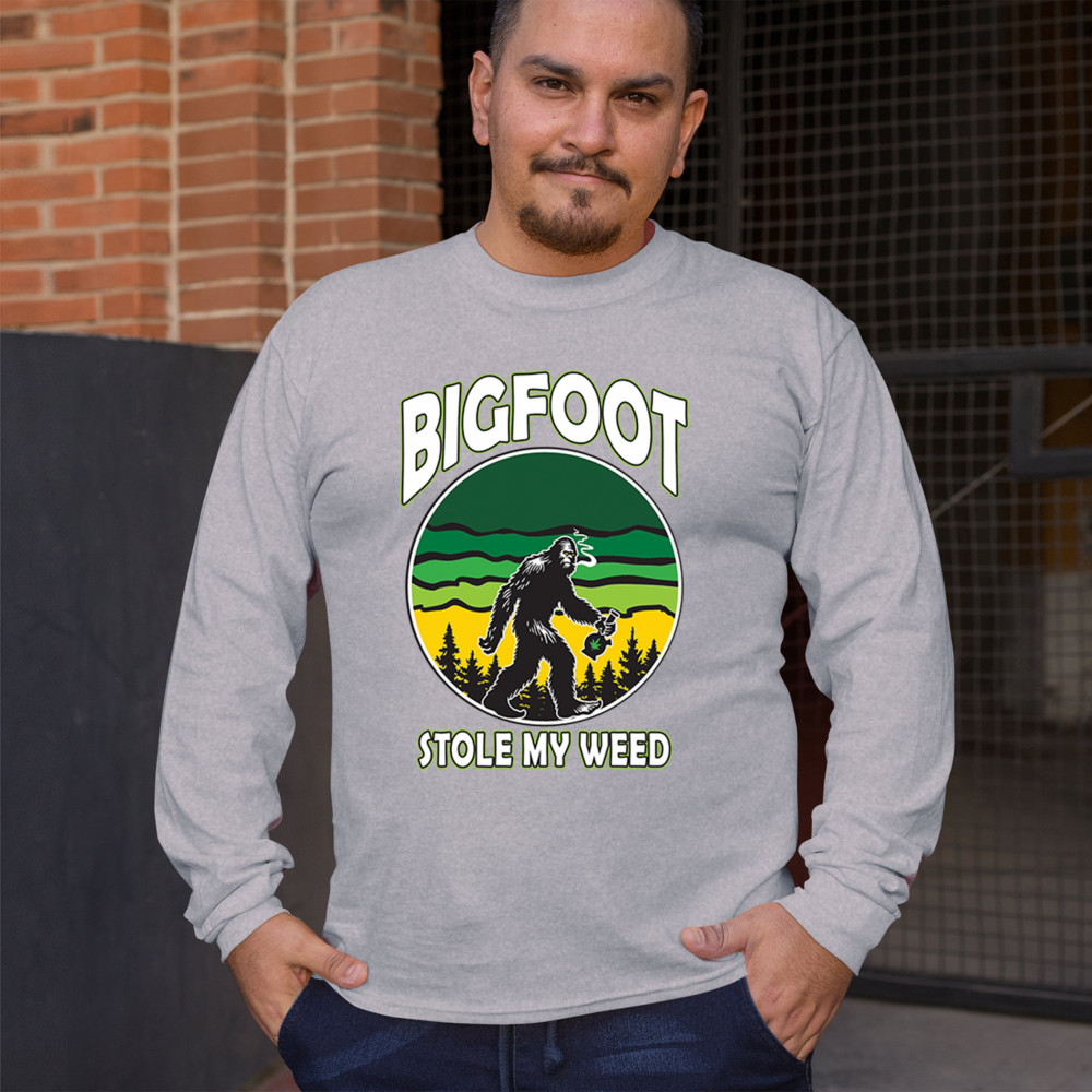 Humorous "Bigfoot Stole My Weed" design featuring Bigfoot and a cannabis leaf. Perfect for fans of Mary Jane, stoned humor, and a chill lifestyle.