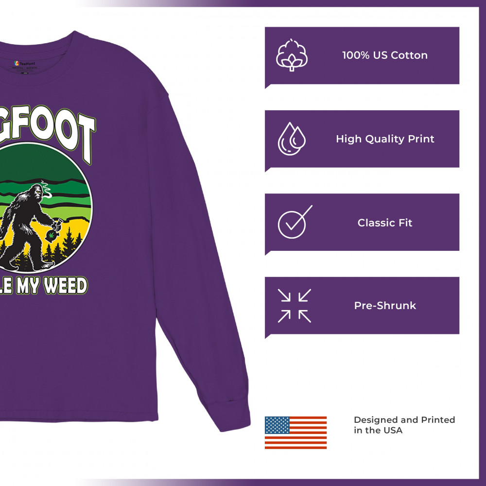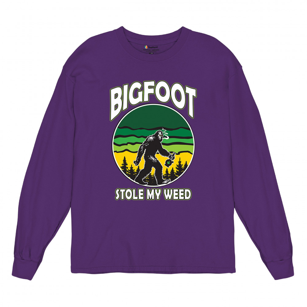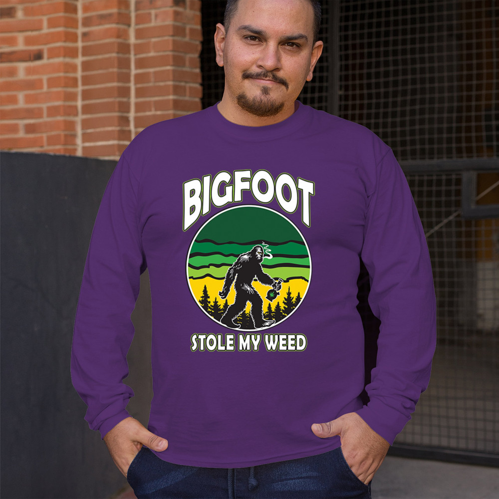 Humorous "Bigfoot Stole My Weed" design featuring Bigfoot and a cannabis leaf. Perfect for fans of Mary Jane, stoned humor, and a chill lifestyle.