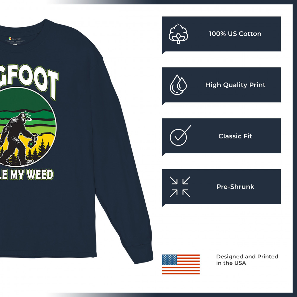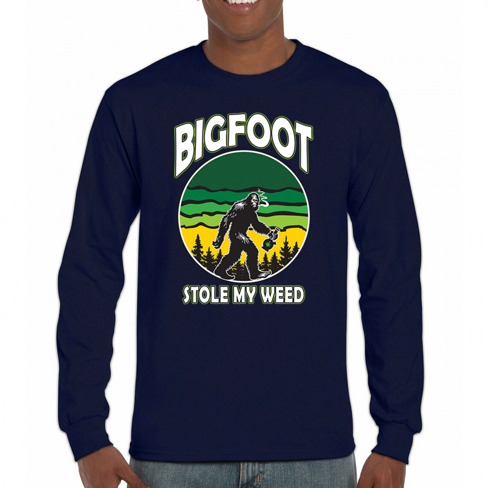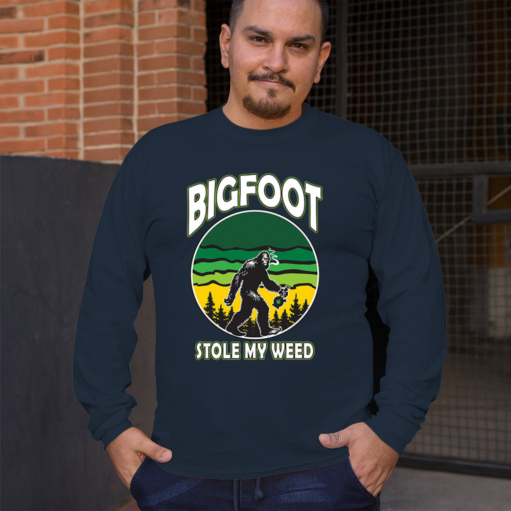Humorous "Bigfoot Stole My Weed" design featuring Bigfoot and a cannabis leaf. Perfect for fans of Mary Jane, stoned humor, and a chill lifestyle.
