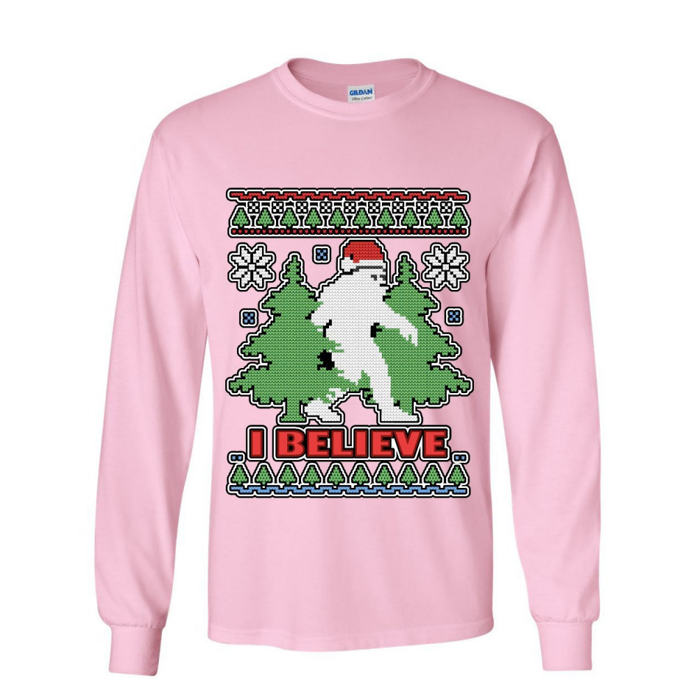 I BELIEVE bigfoot ugly sweatshirt long sleeve t-shirt funny christmas yeti tee light pink