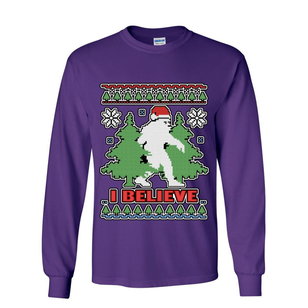 I BELIEVE bigfoot ugly sweatshirt long sleeve t-shirt funny christmas yeti tee purple