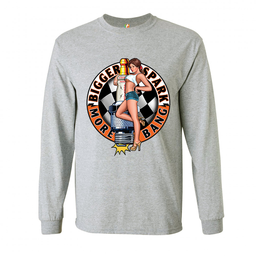 BIGGER SPARK MORE BANG long sleeve t-shirt pin-up girl vintage automotive gray