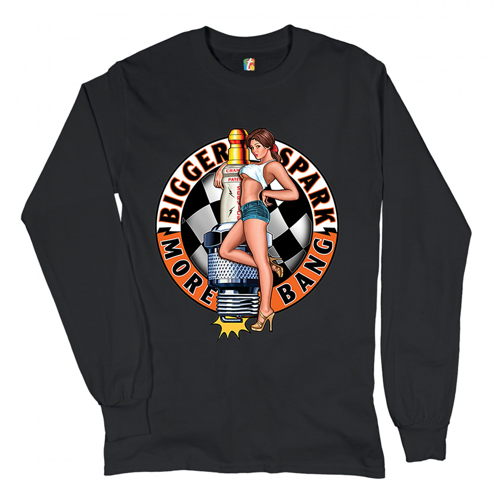 BIGGER SPARK MORE BANG long sleeve t-shirt pin-up girl vintage automotive black