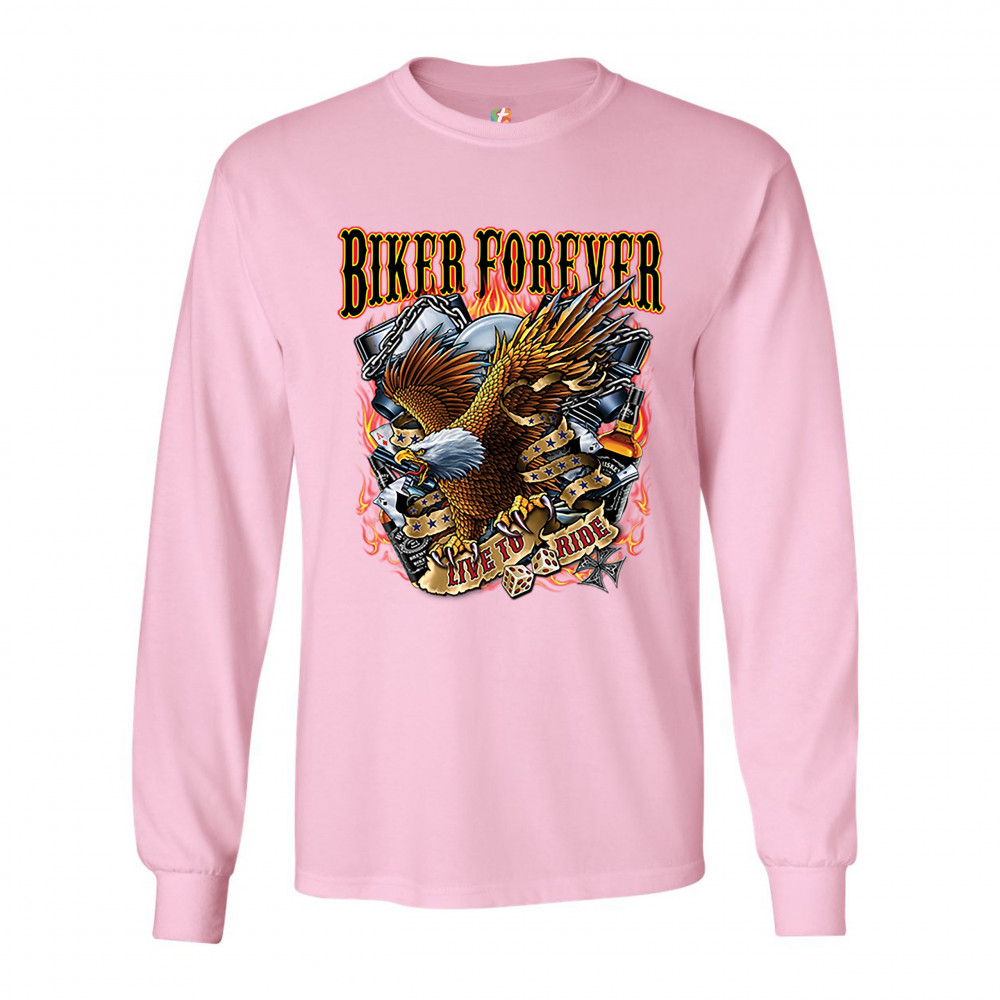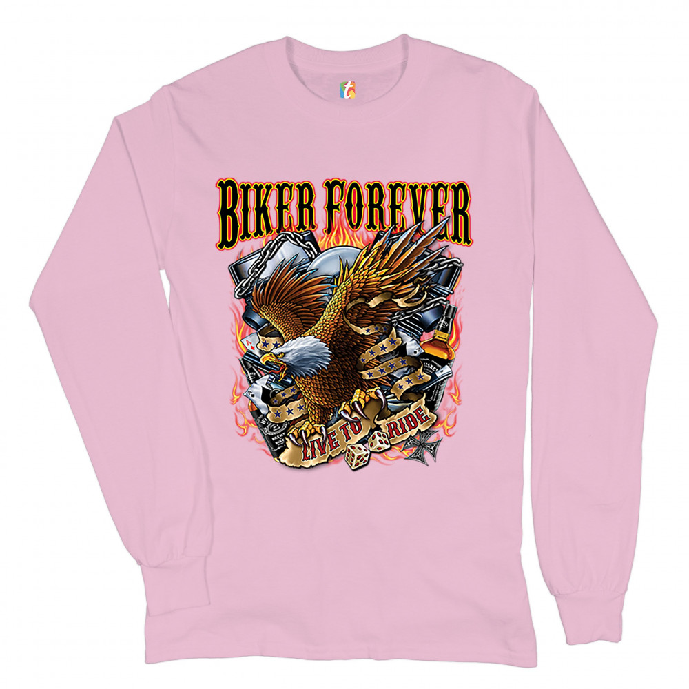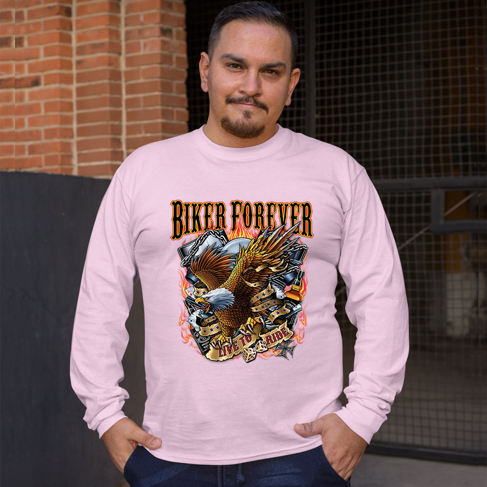 A print featuring an American bald eagle, holding a stripe with "live to ride" written on it, a v-engine in the background, a pair of dice and playing cards. At the top the print says: "biker forever". A great choice for a motorcycle enthusiast.