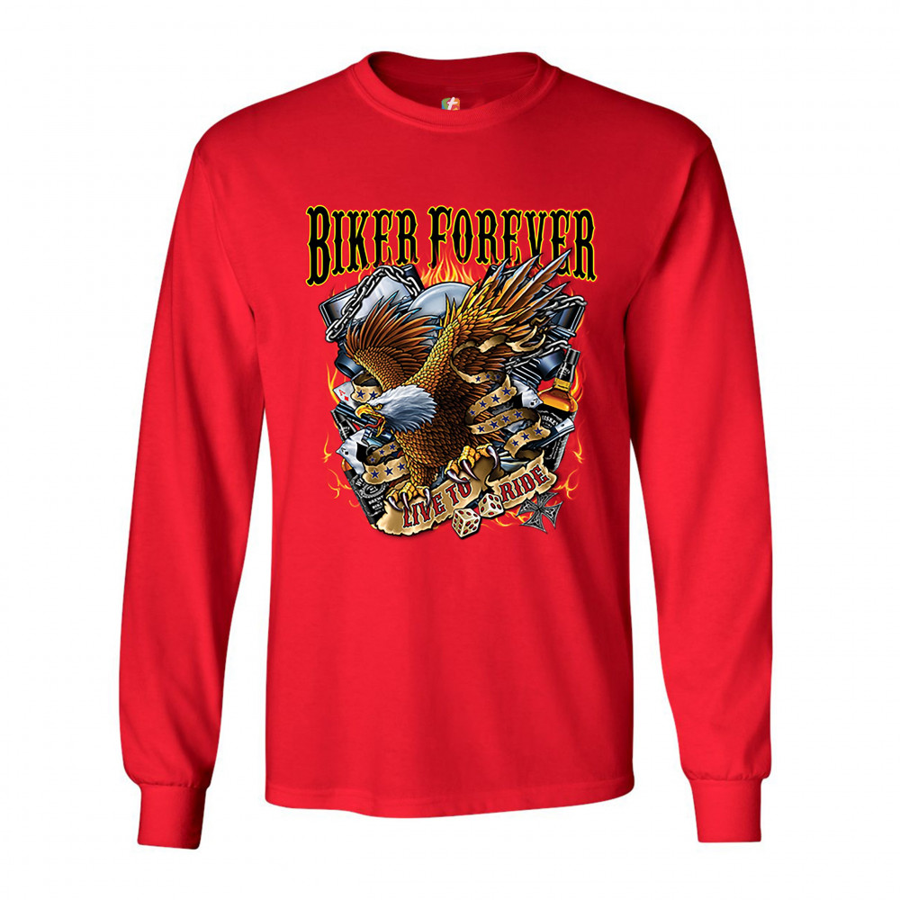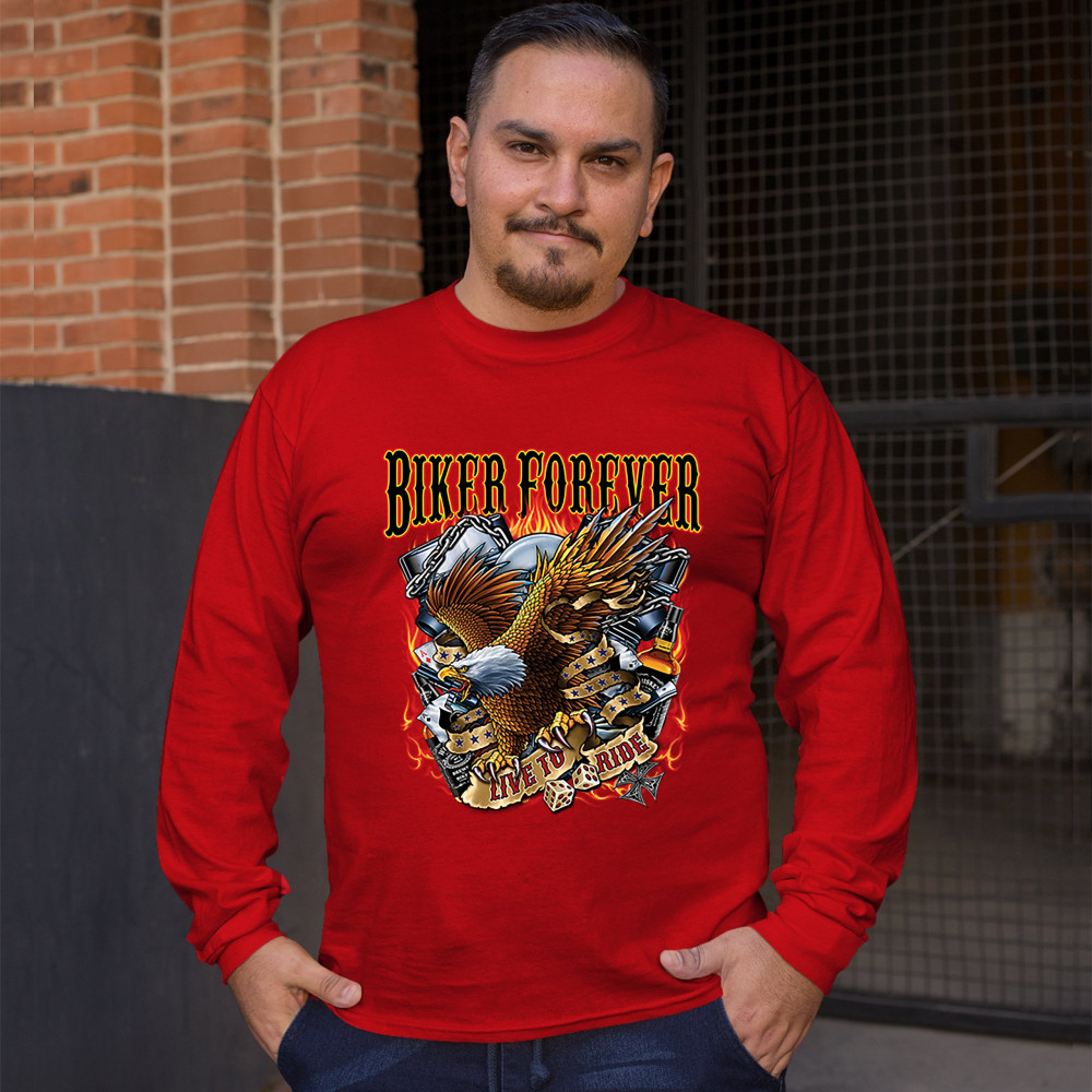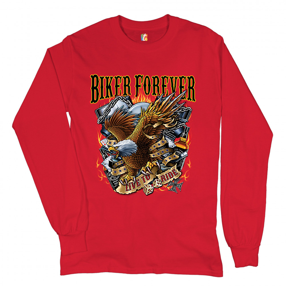 A print featuring an American bald eagle, holding a stripe with "live to ride" written on it, a v-engine in the background, a pair of dice and playing cards. At the top the print says: "biker forever". A great choice for a motorcycle enthusiast.