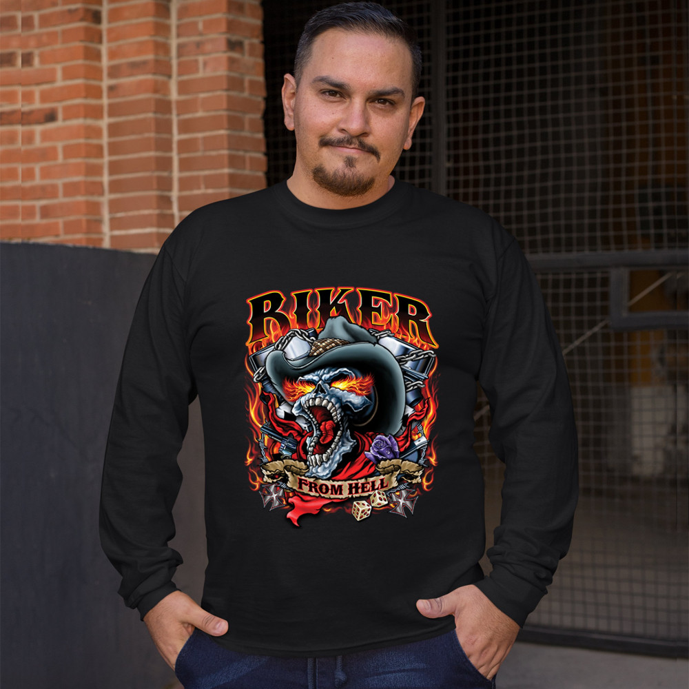 A print featuring a roaring skeleton with burning eyes wearing a cowboy's hat. There are also crosses, dice, a rose and a revolver. The print says: "biker from hell". A great choice for a motorcycle enthusiast.