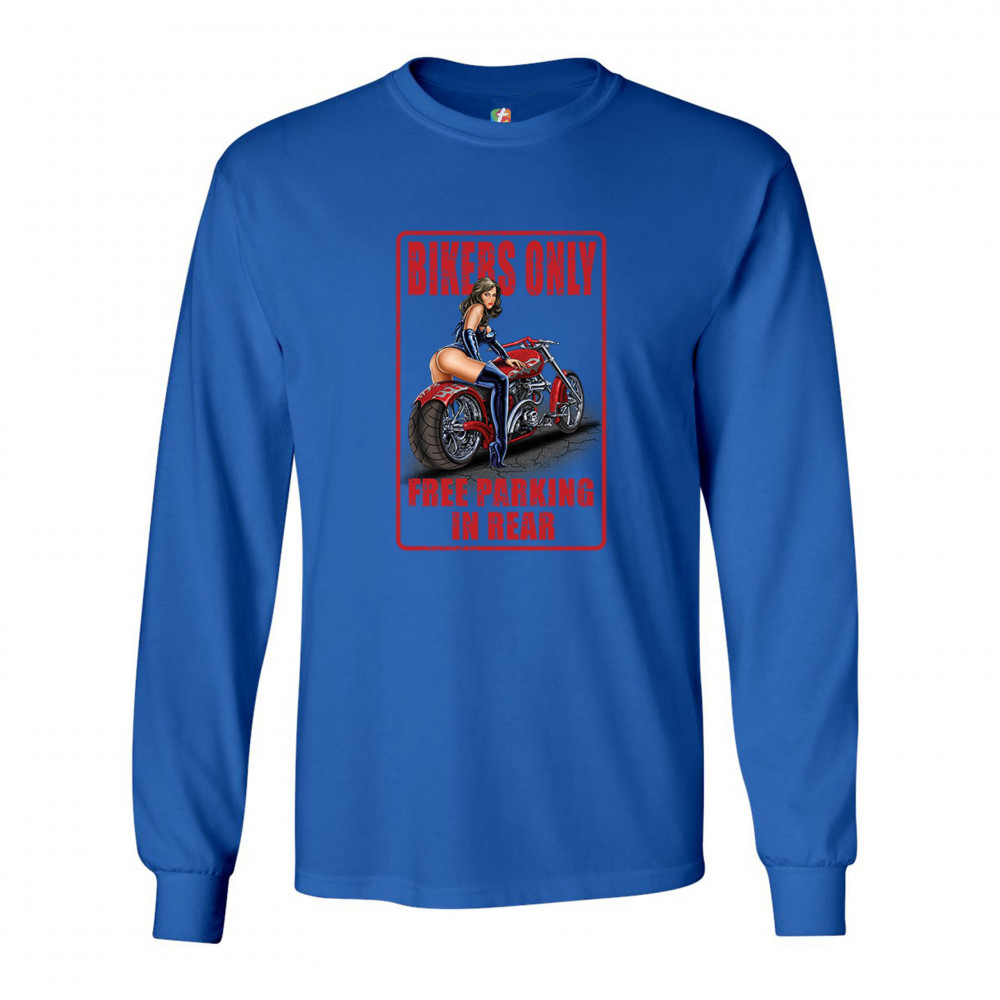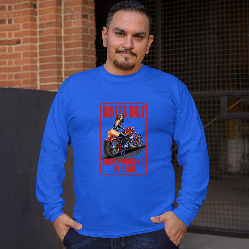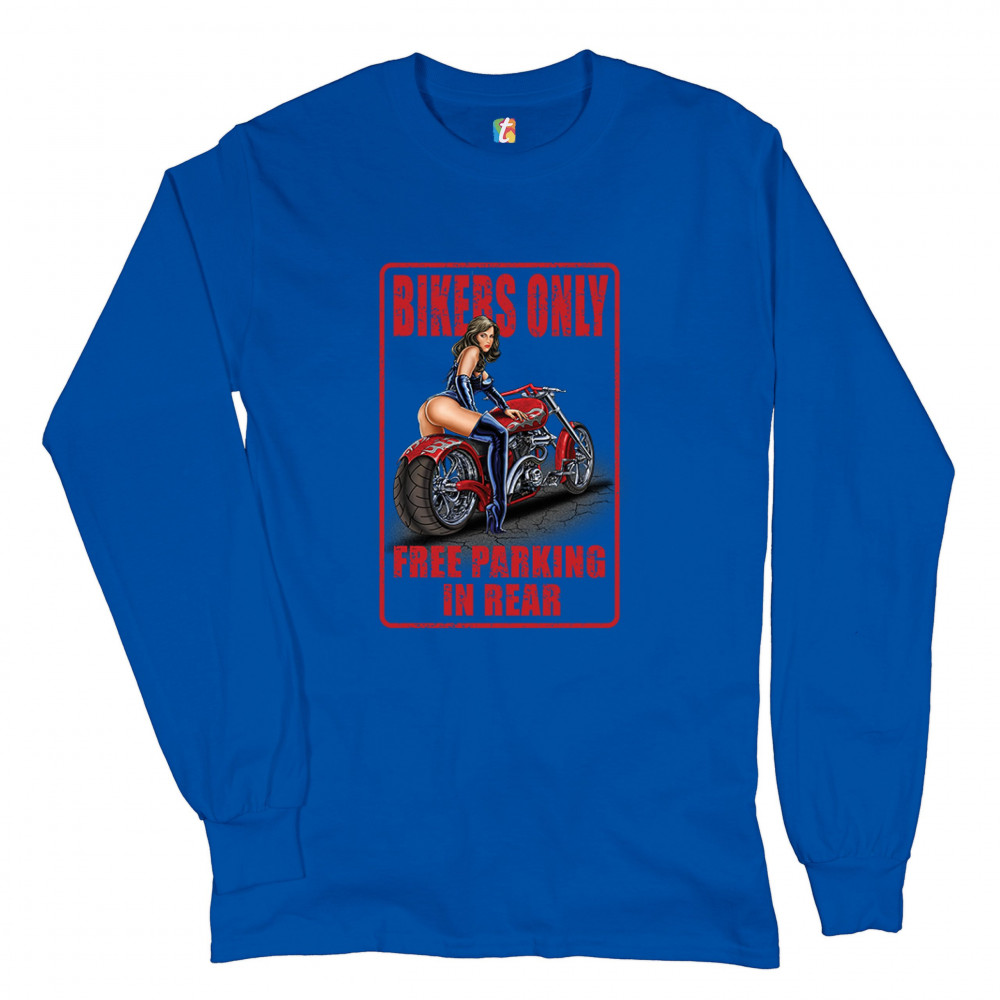 BIKERS ONLY FREE PARKING IN REAR long sleeve t-shirt funny pin-up biker chick royal blue