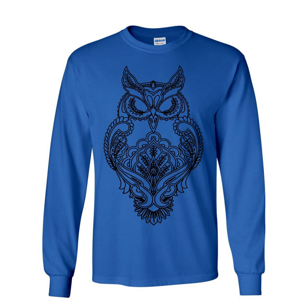 BLACK OWL HENNA STYLE long sleeve t-shirt wildlife nature knowledge wisdom tee royal blue