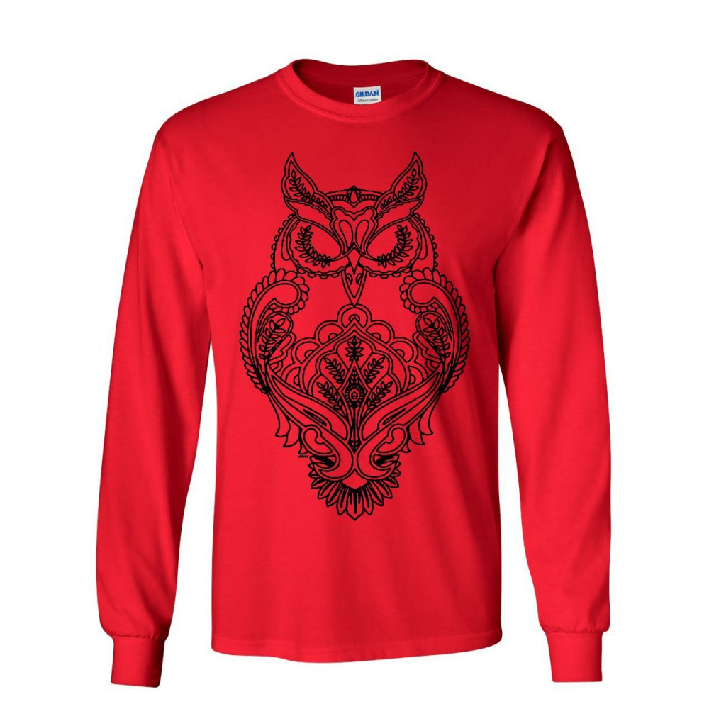 BLACK OWL HENNA STYLE long sleeve t-shirt wildlife nature knowledge wisdom tee red