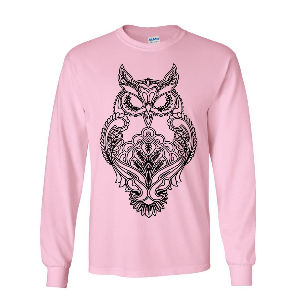 BLACK OWL HENNA STYLE long sleeve t-shirt wildlife nature knowledge wisdom tee light pink