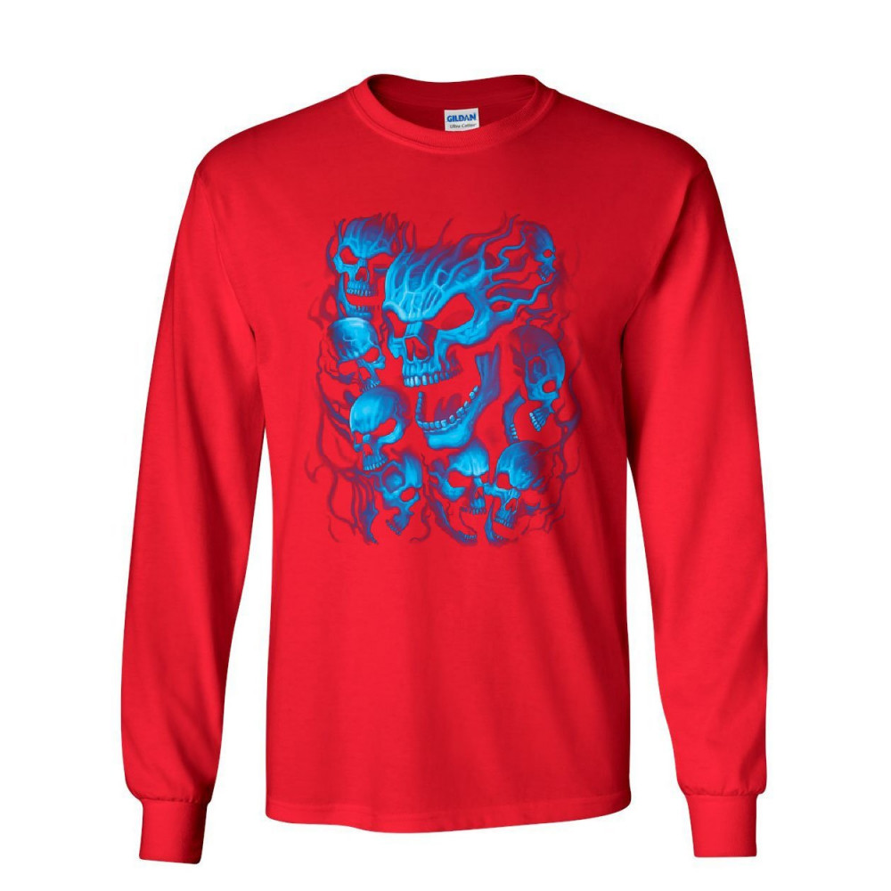 BLUE SKULLS long sleeve t-shirt skull face death dead reaper hell evil demon tee red
