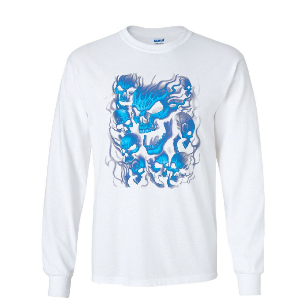 BLUE SKULLS long sleeve t-shirt skull face death dead reaper hell evil demon tee white