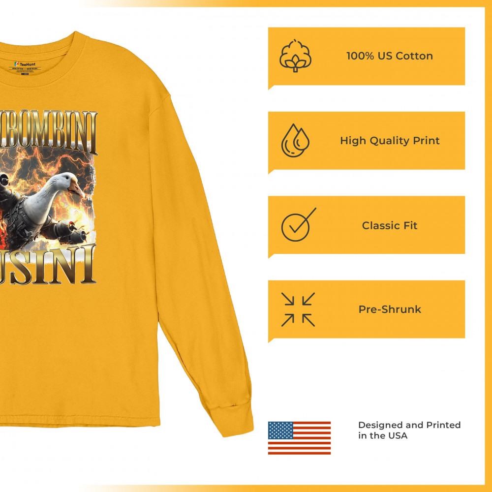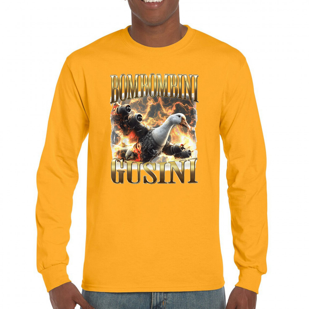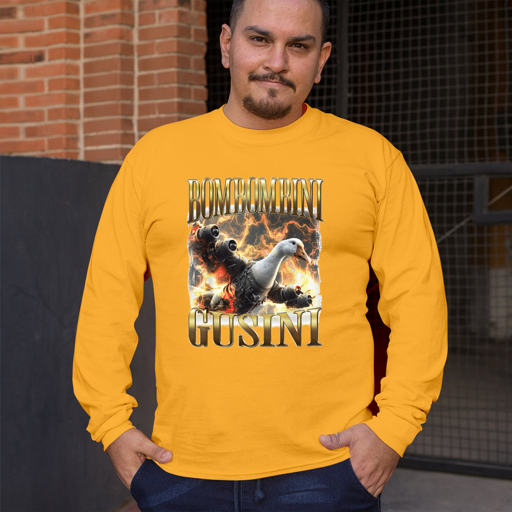 Bombombini Gusini is meme chaos at Mach speed. Featuring a mechanized goose powered by pure Italian Brainrot energy, this design blends cursed-core humor, Gen Z absurdity, ironic fashion, and weirdcore visuals. Perfect for animal meme fans, TikTok-core addicts, and anyone whose humor is completely unhinged.
