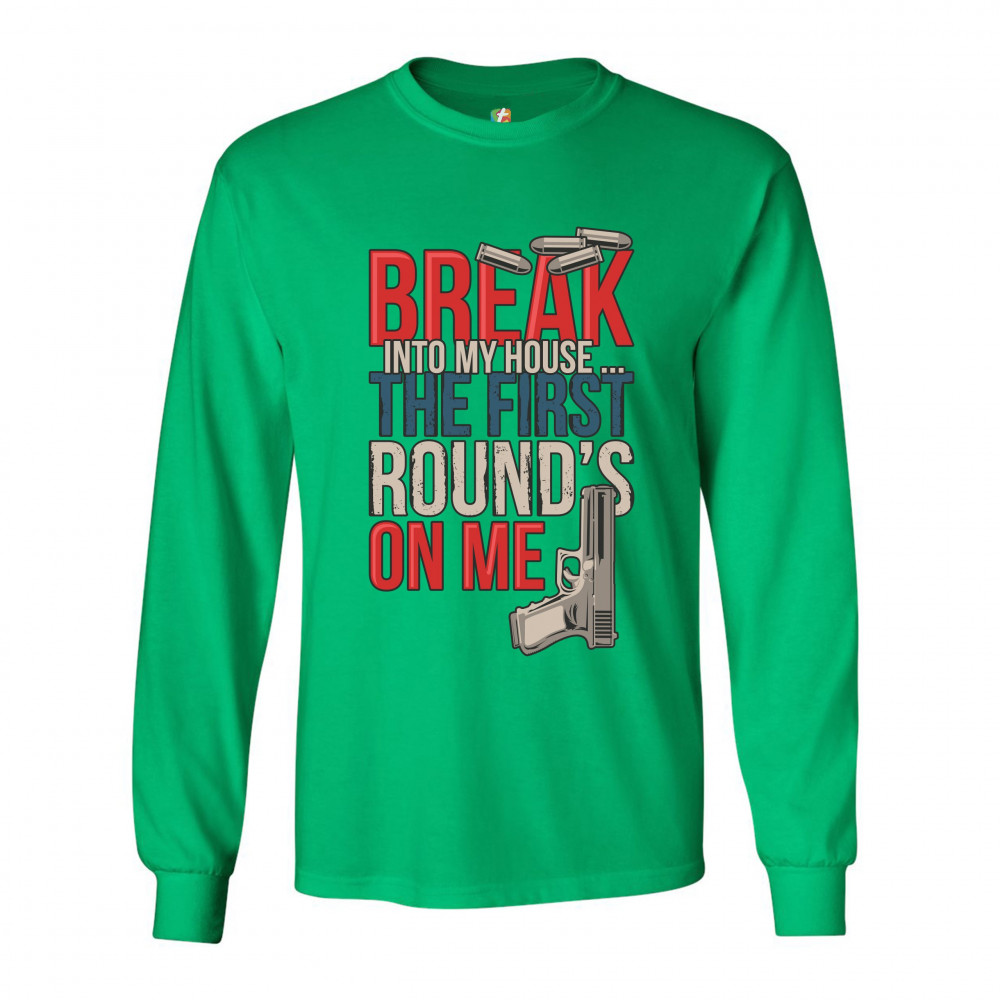 BREAK INTO MY HOUSE.. THE FIRST ROUND'S ON ME long sleeve t-shirt 2nd amendment green