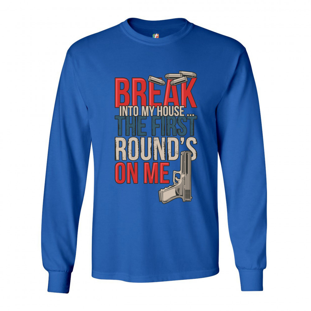 BREAK INTO MY HOUSE.. THE FIRST ROUND'S ON ME long sleeve t-shirt 2nd amendment royal blue
