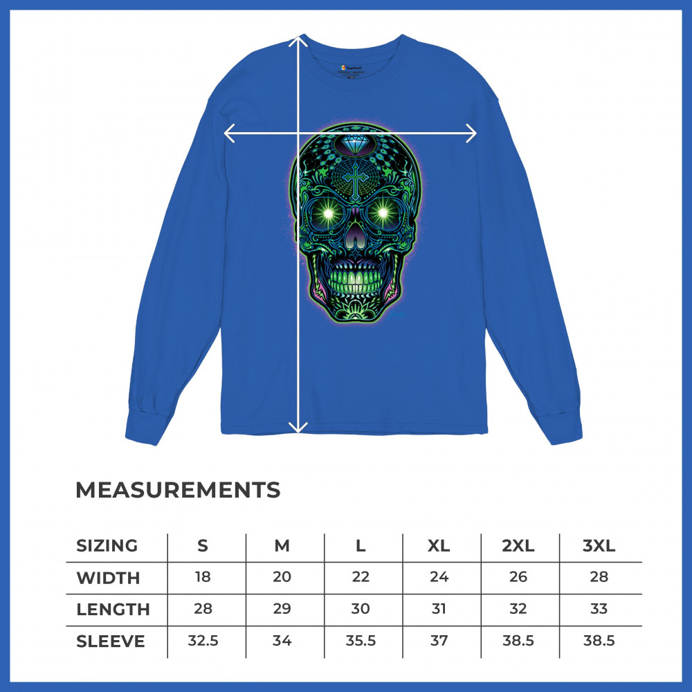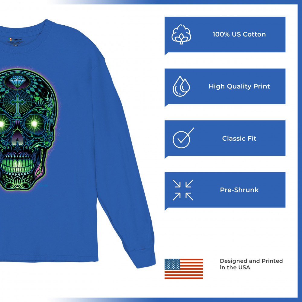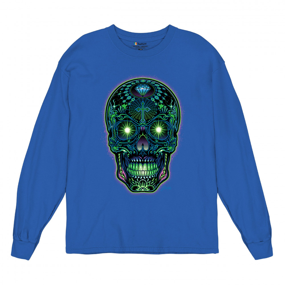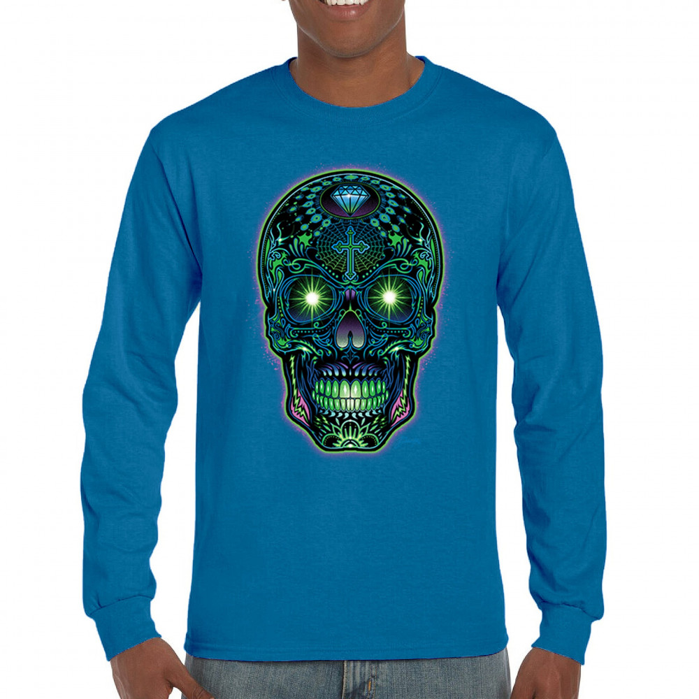 This electrified sugar skull design glows with neon energy and intricate details. Featuring green eyes, radiant cross, diamond, spider web, and vivid colors, it's a bold mash-up of psychedelic art, Day of the Dead tradition, and rave culture. A vibrant design perfect for skull fans and spiritual rebels alike.
