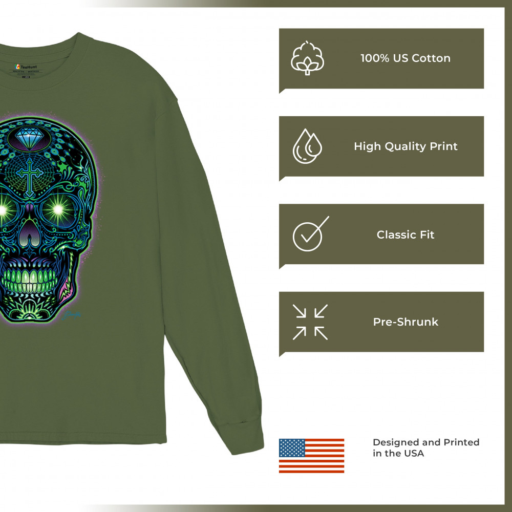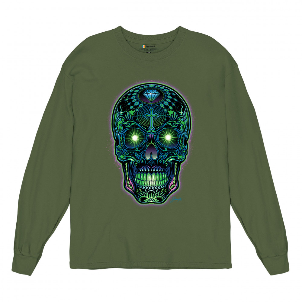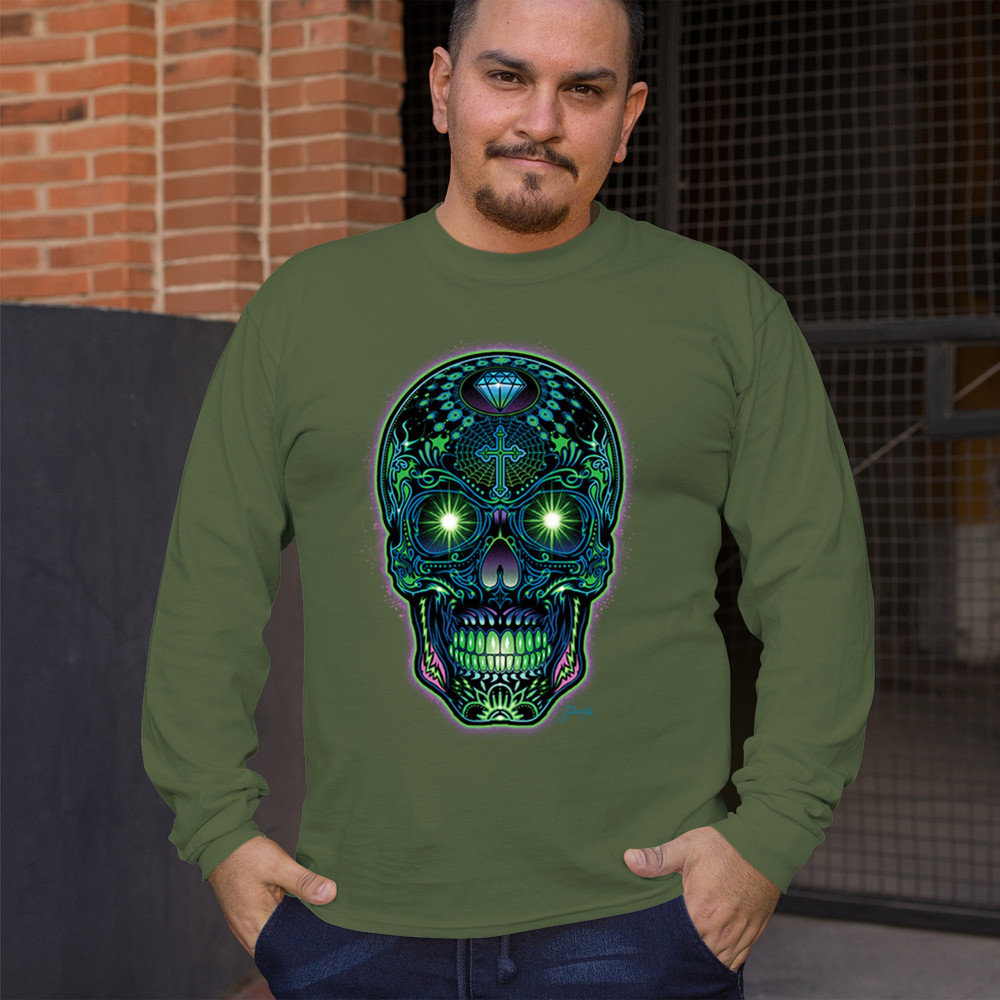 Electrified sugar skull with glowing green eyes, neon cross and diamond, perfect for rave lovers, skull art fans, and Day of the Dead style.
