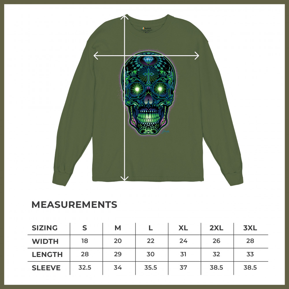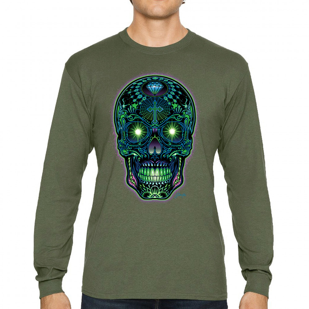 This electrified sugar skull design glows with neon energy and intricate details. Featuring green eyes, radiant cross, diamond, spider web, and vivid colors, it's a bold mash-up of psychedelic art, Day of the Dead tradition, and rave culture. A vibrant design perfect for skull fans and spiritual rebels alike.