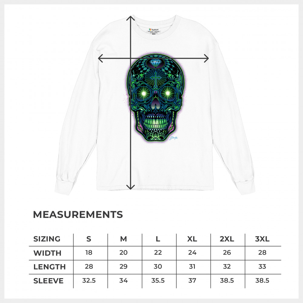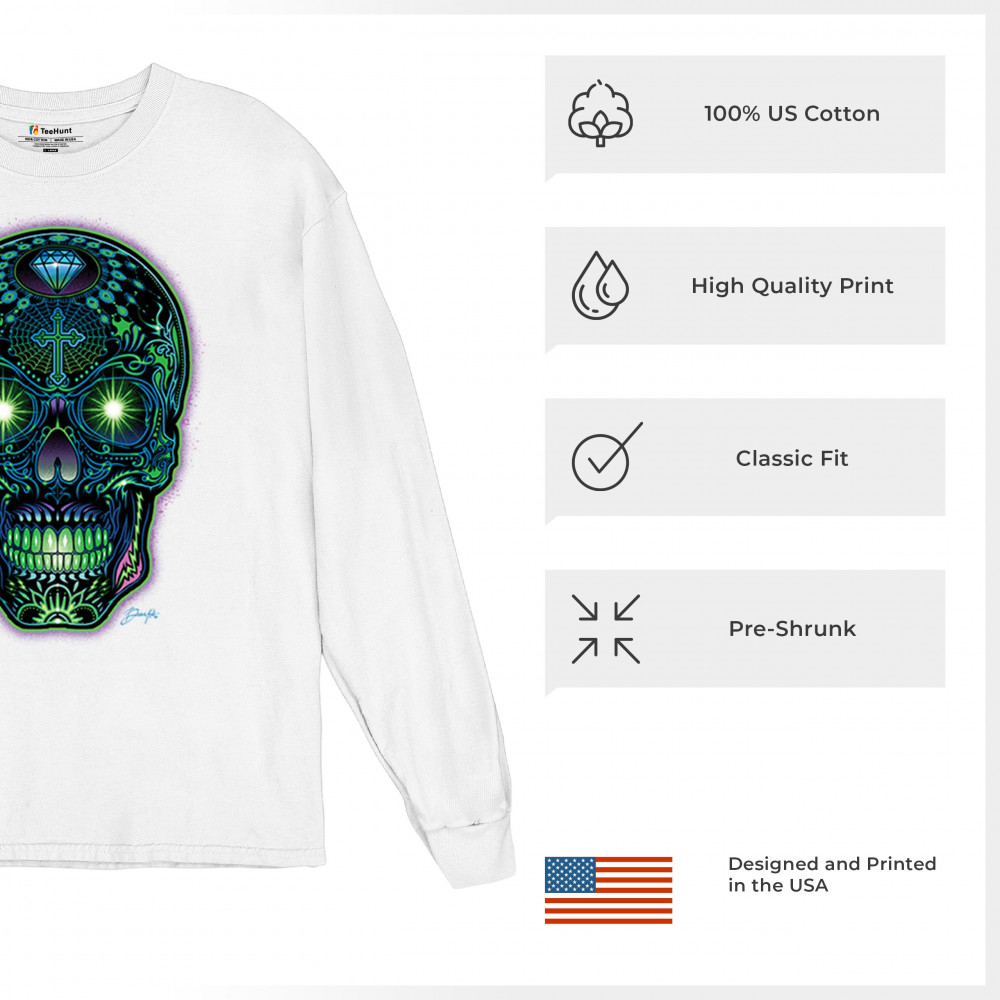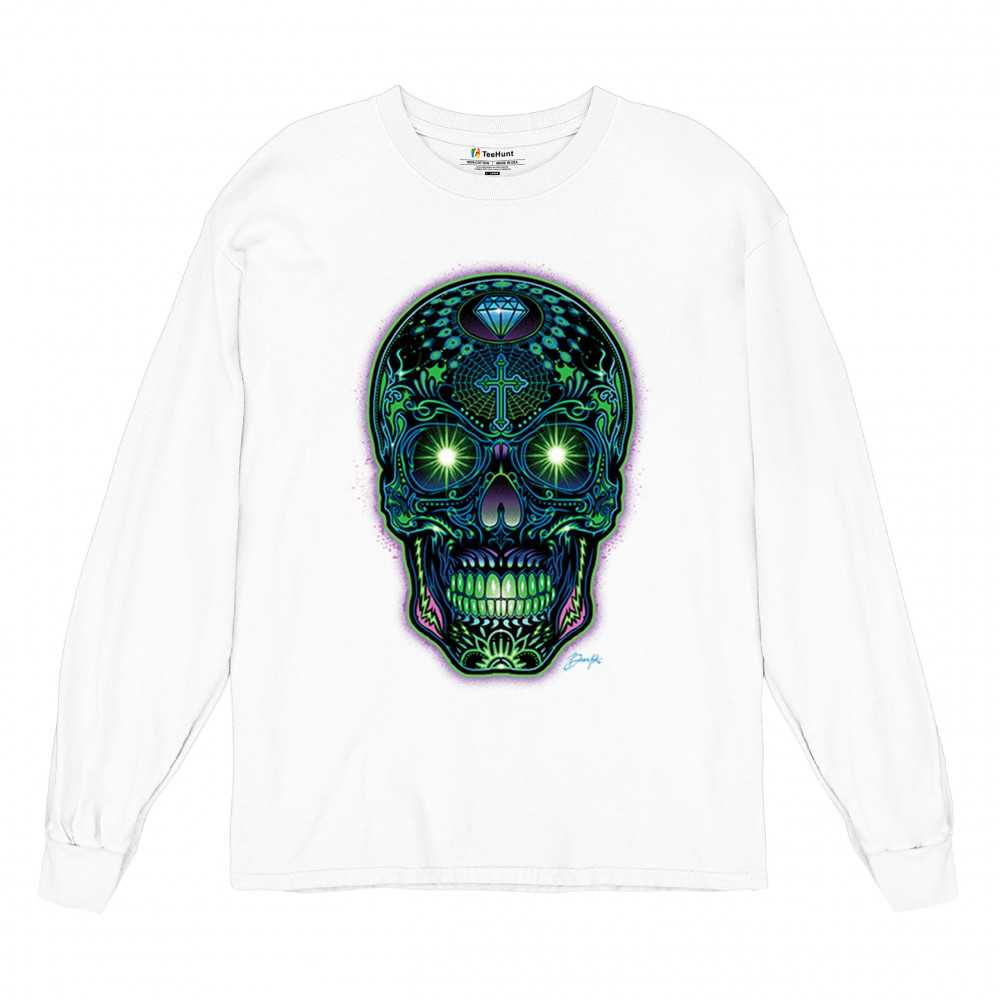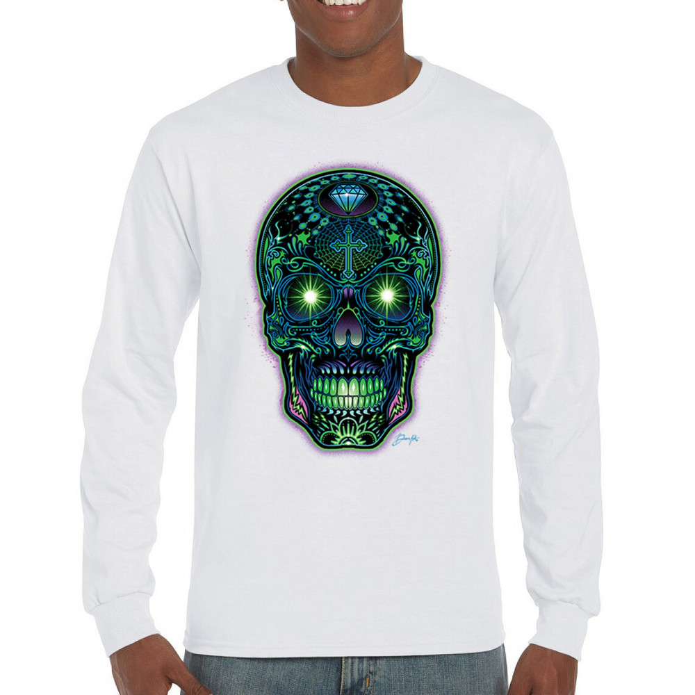 This electrified sugar skull design glows with neon energy and intricate details. Featuring green eyes, radiant cross, diamond, spider web, and vivid colors, it's a bold mash-up of psychedelic art, Day of the Dead tradition, and rave culture. A vibrant design perfect for skull fans and spiritual rebels alike.