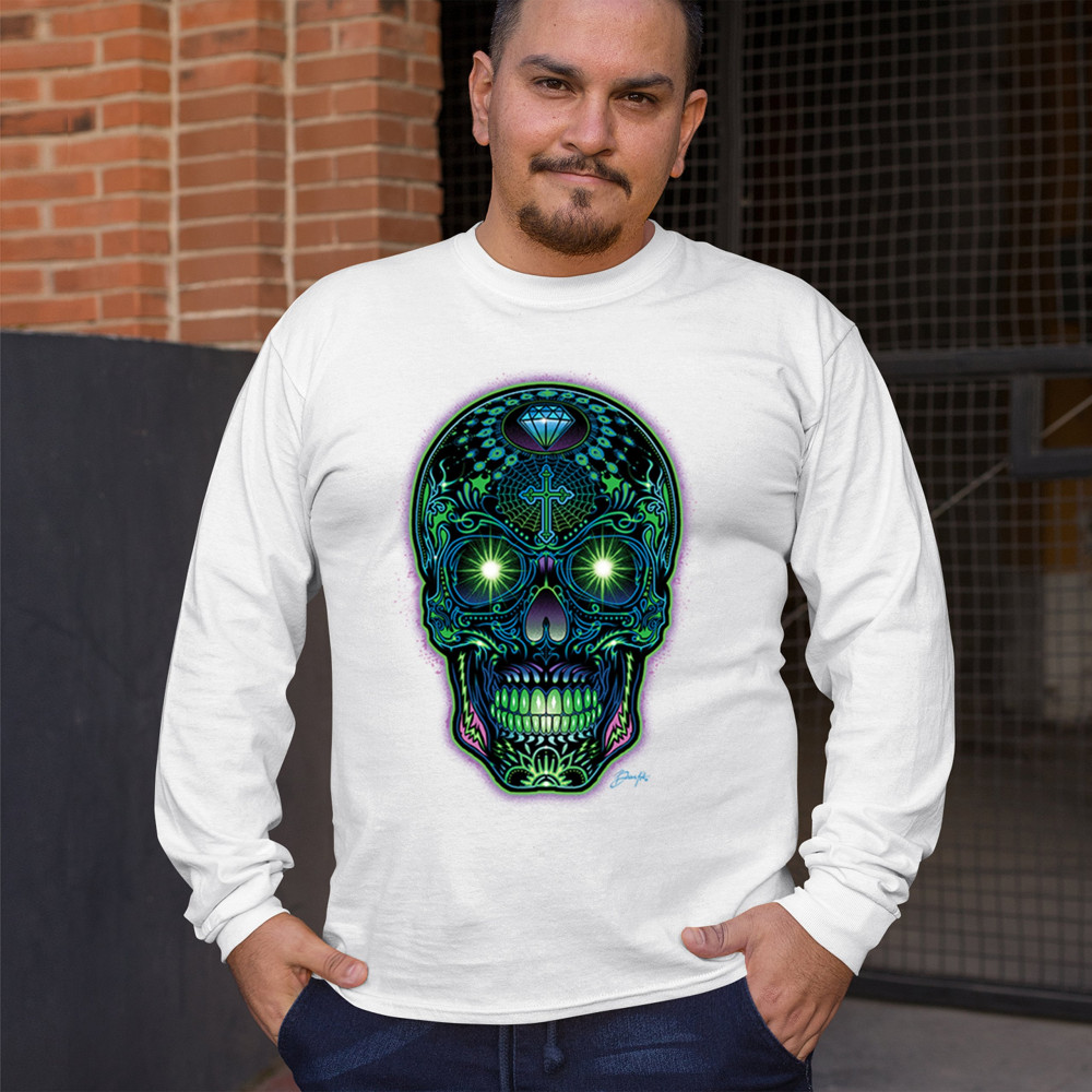 Electrified sugar skull with glowing green eyes, neon cross and diamond, perfect for rave lovers, skull art fans, and Day of the Dead style.