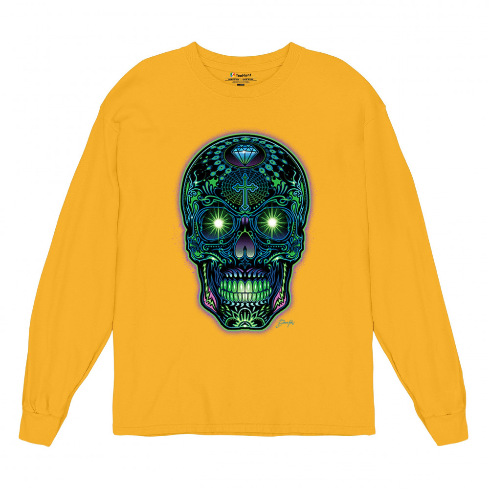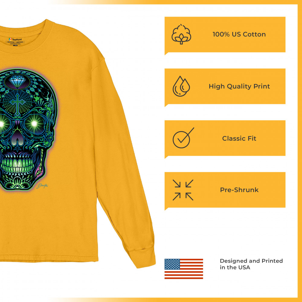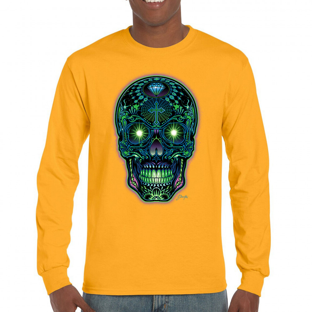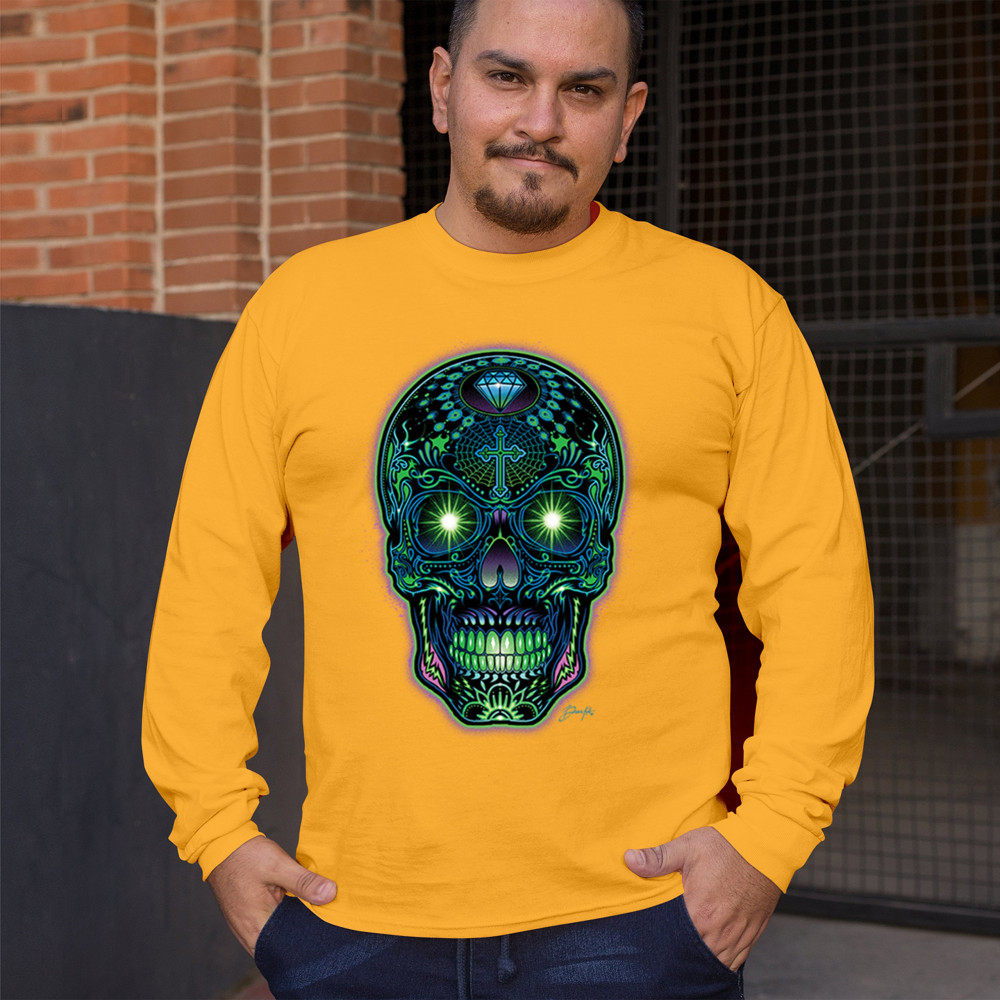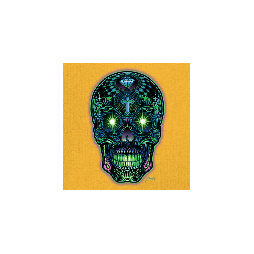 This electrified sugar skull design glows with neon energy and intricate details. Featuring green eyes, radiant cross, diamond, spider web, and vivid colors, it's a bold mash-up of psychedelic art, Day of the Dead tradition, and rave culture. A vibrant design perfect for skull fans and spiritual rebels alike.