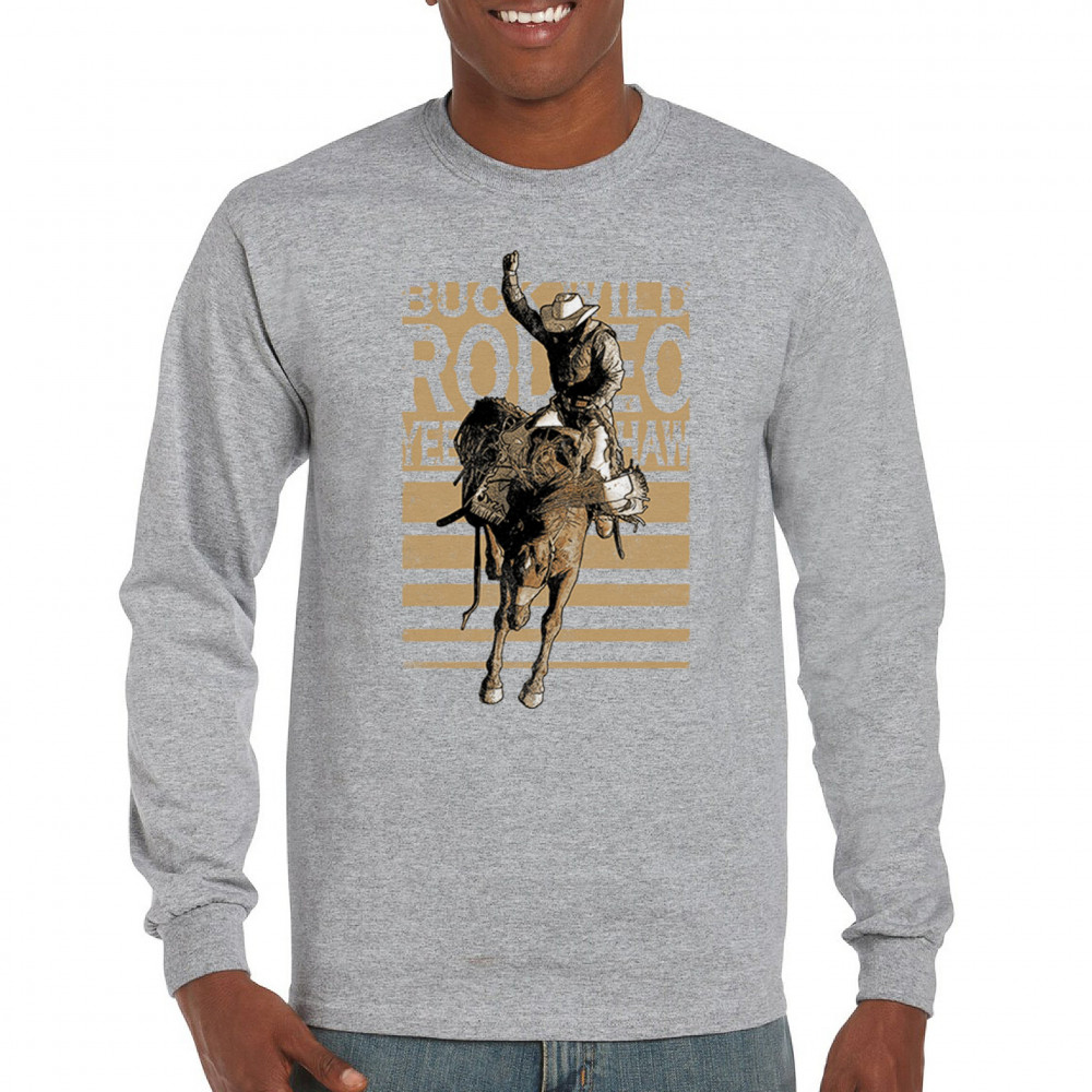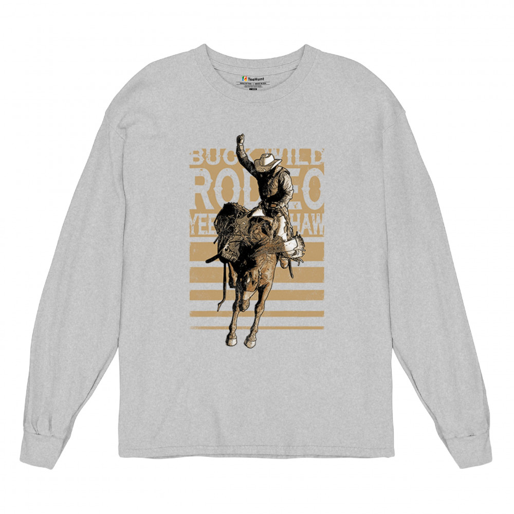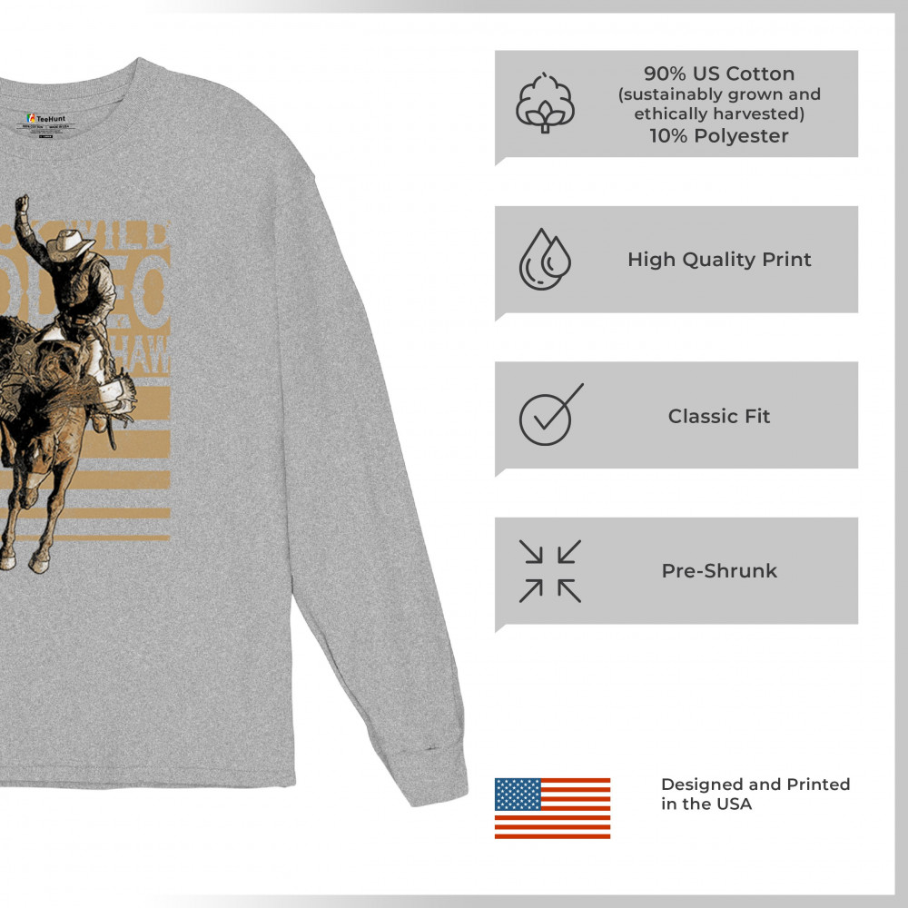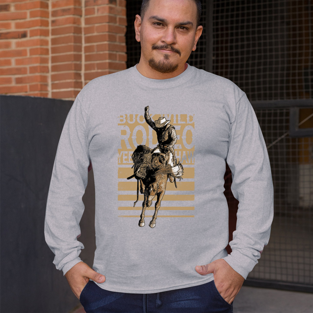 Rodeo bronc rider design with cowboy grit. Western graphic for fans of ranch life, bucking broncos, and rodeo events.