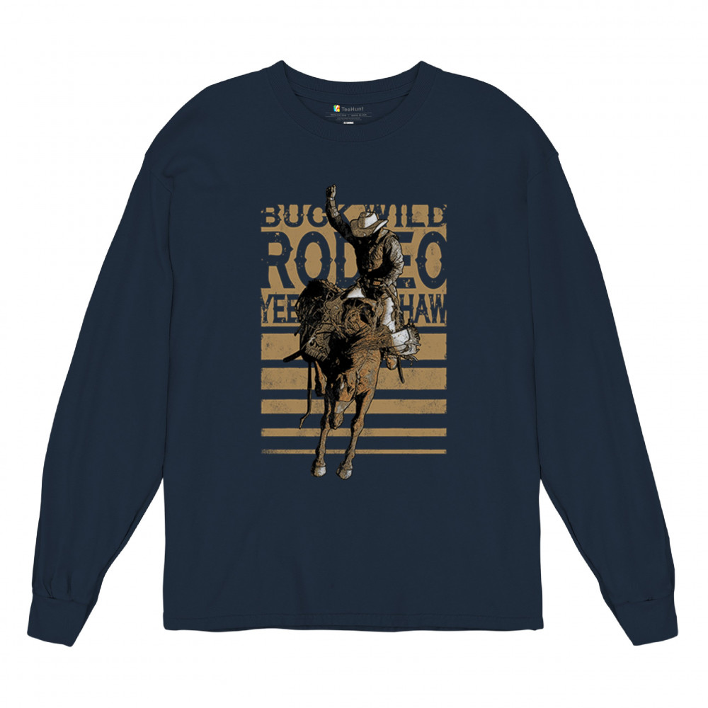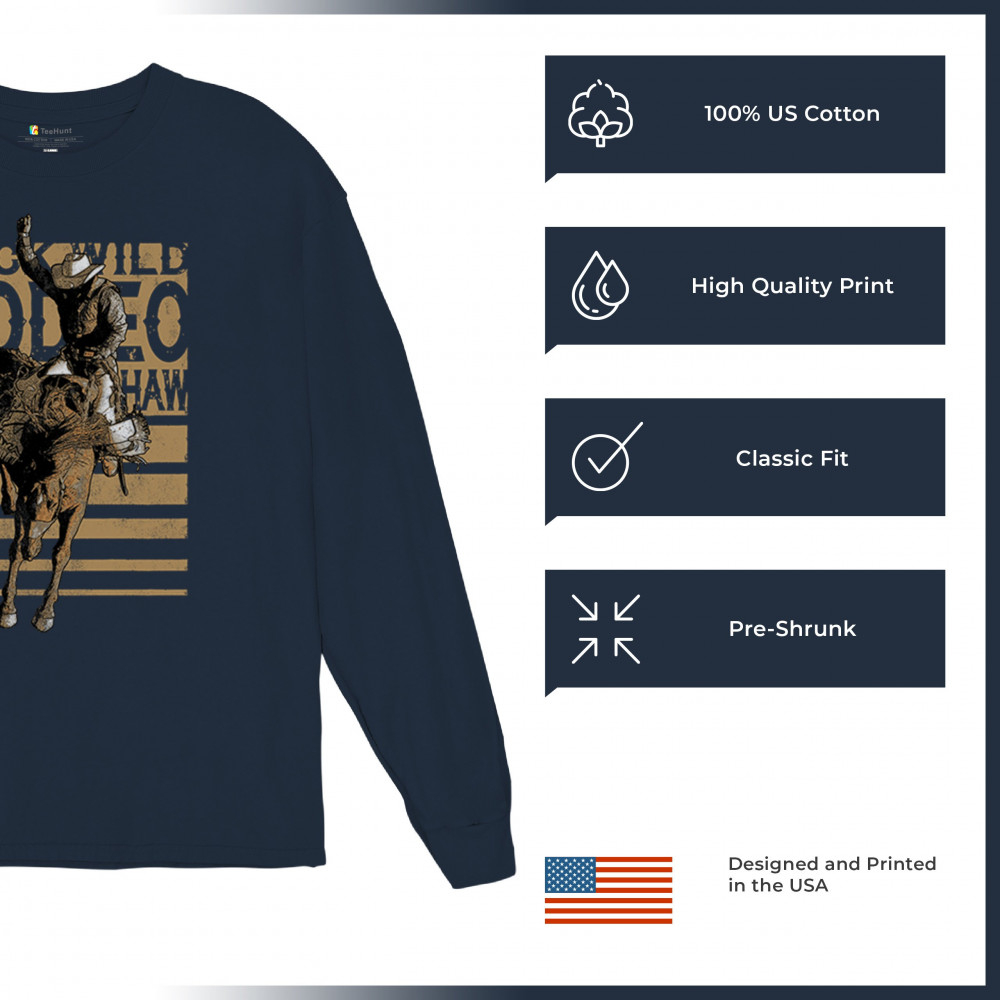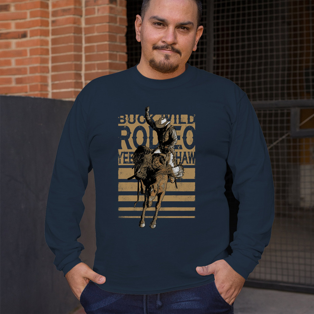 Rodeo bronc rider design with cowboy grit. Western graphic for fans of ranch life, bucking broncos, and rodeo events.