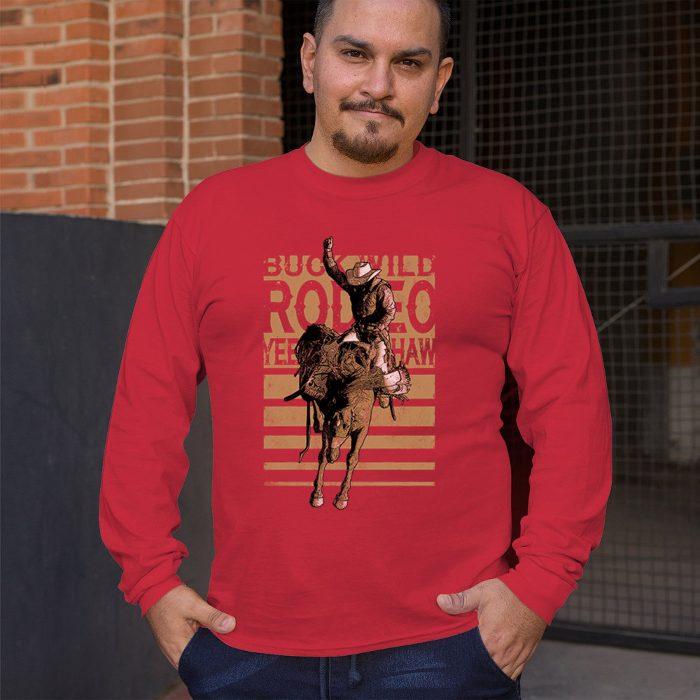 Rodeo bronc rider design with cowboy grit. Western graphic for fans of ranch life, bucking broncos, and rodeo events.