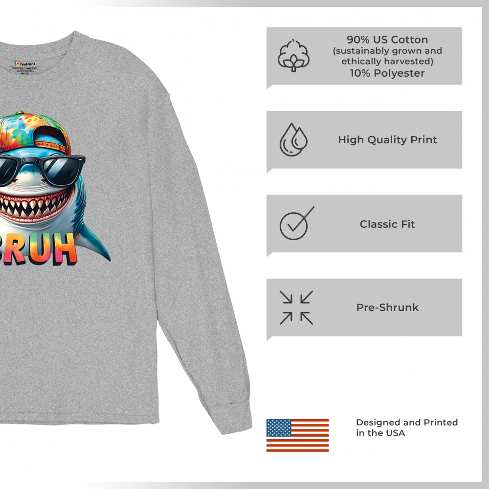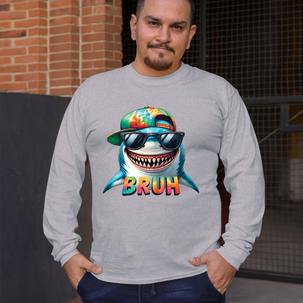Bruh Shark meme shirt with Gen Z humor, cartoon shark design, summer beach vibes, Sigma Aura, and Italian Brainrot internet humor.