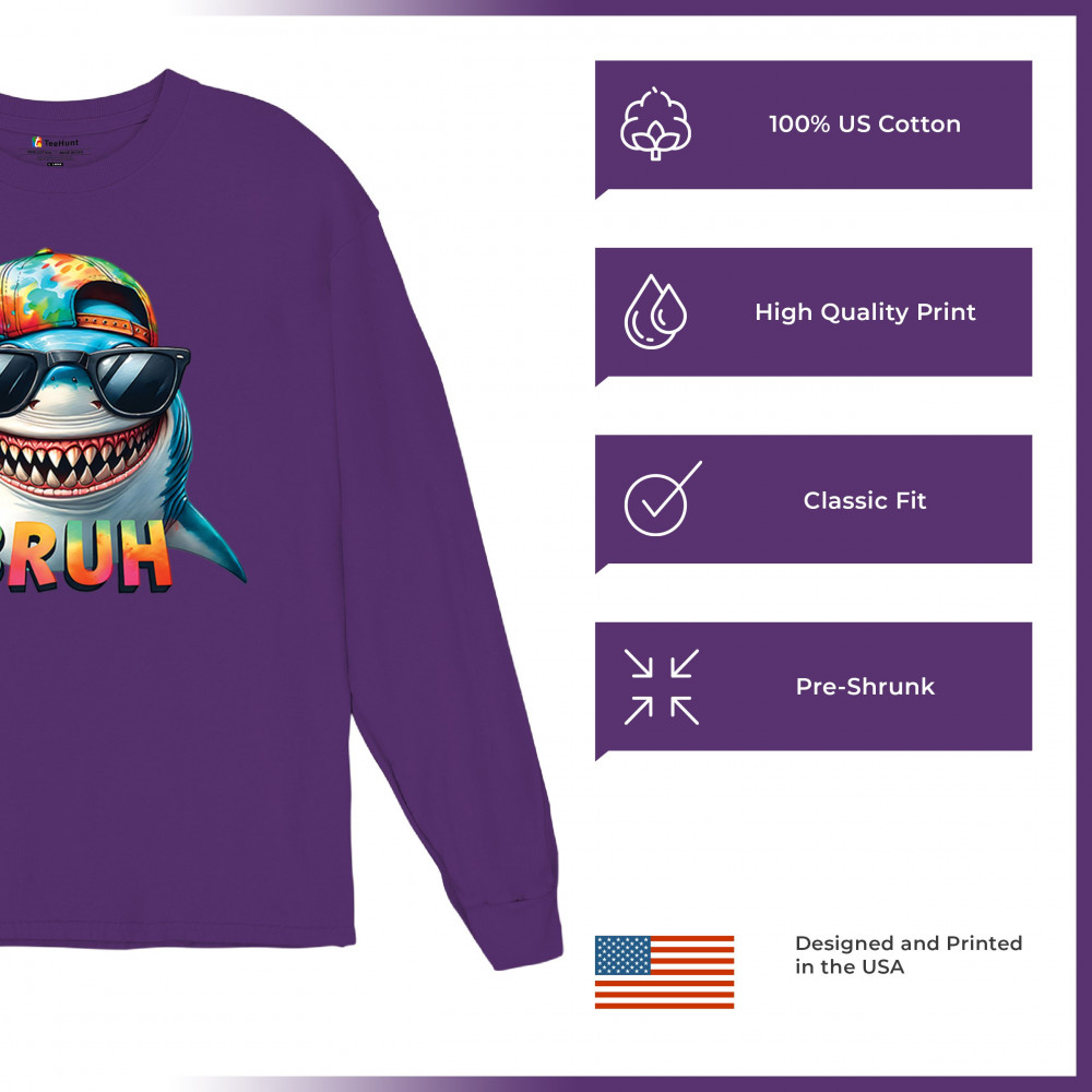 Bruh Shark meme shirt with Gen Z humor, cartoon shark design, summer beach vibes, Sigma Aura, and Italian Brainrot internet humor.