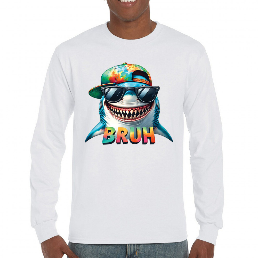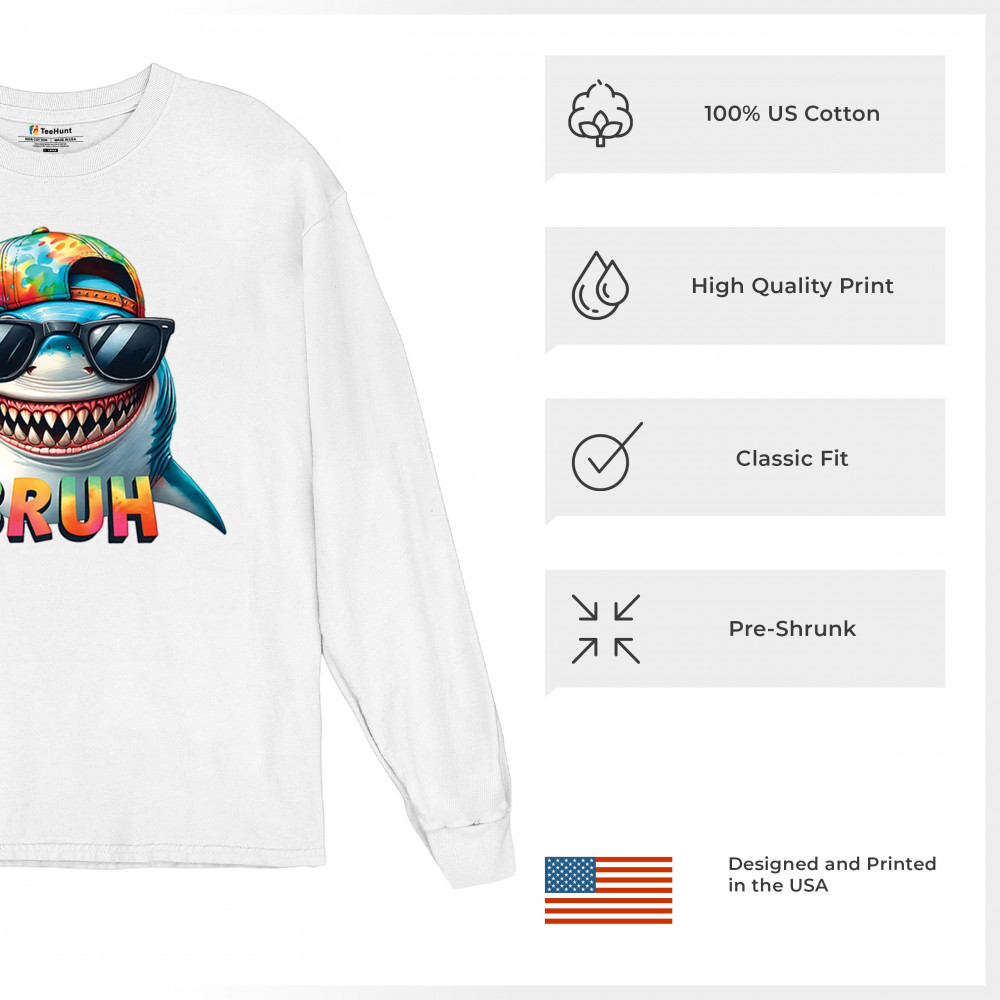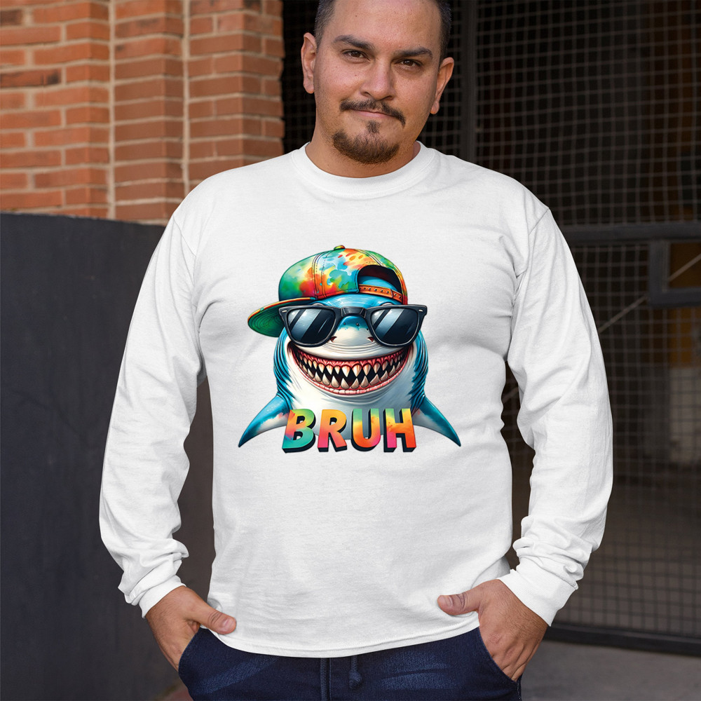 Bruh Shark meme shirt with Gen Z humor, cartoon shark design, summer beach vibes, Sigma Aura, and Italian Brainrot internet humor.