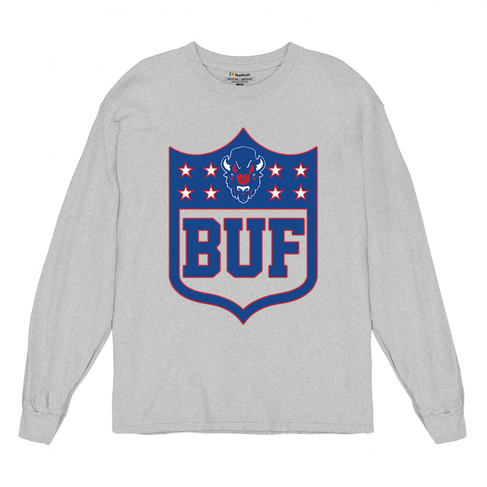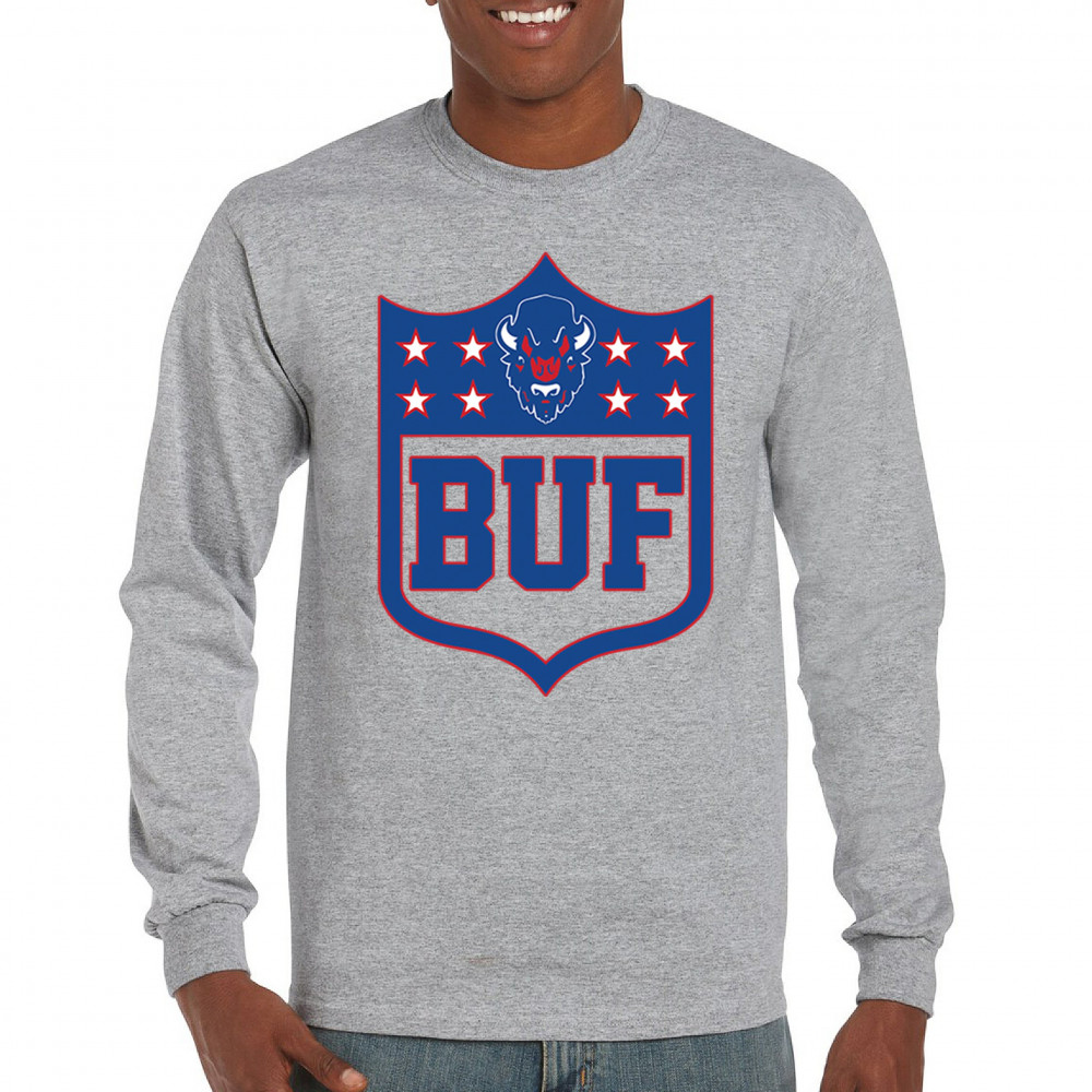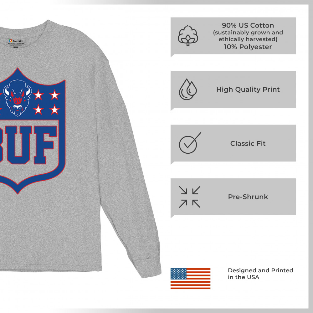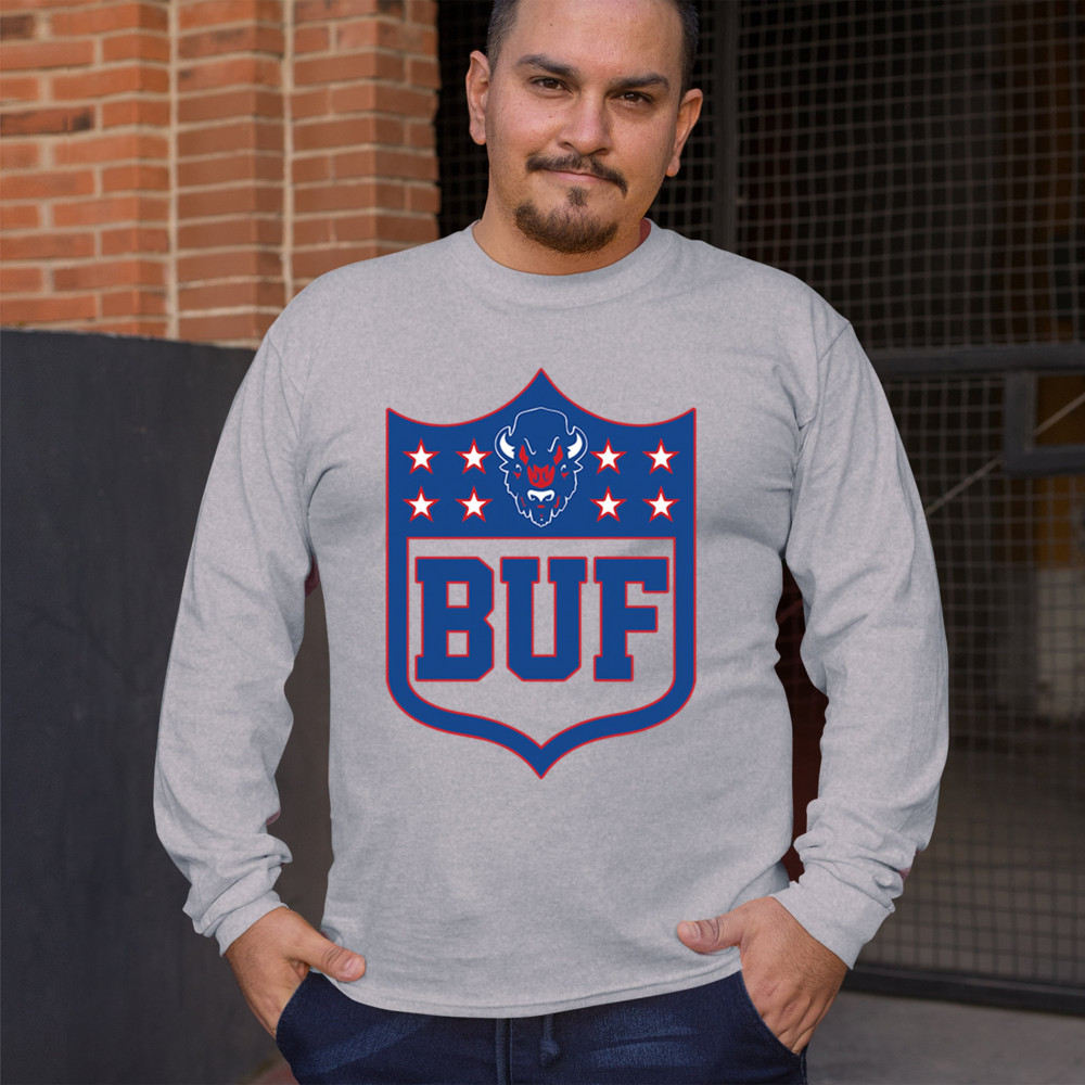 Bold Buffalo bison shield design for game day gear, tailgating, Sunday football, and championship pride in The Queen City.