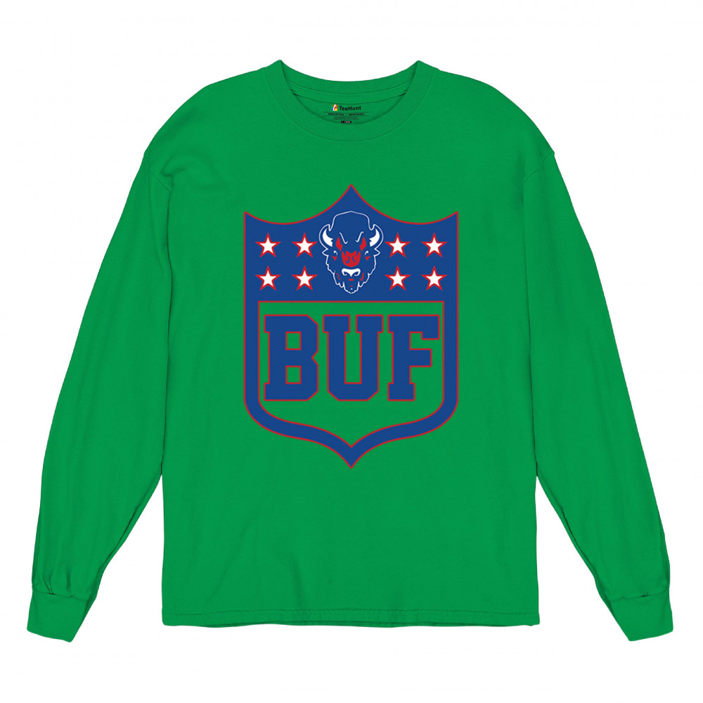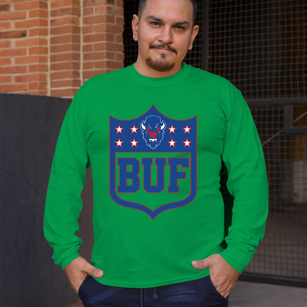 Bold Buffalo bison shield design for game day gear, tailgating, Sunday football, and championship pride in The Queen City.
