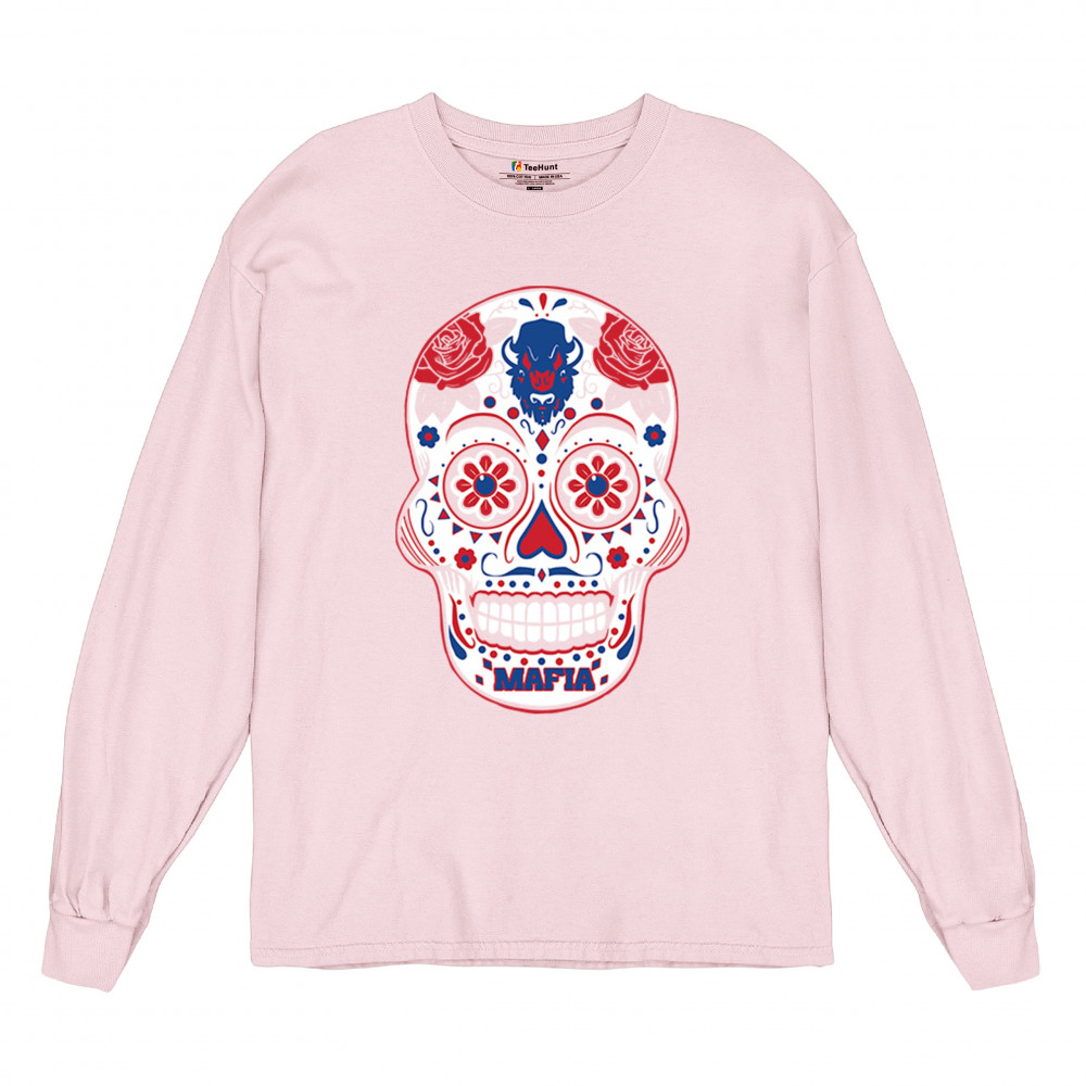 Buffalo Sugar Skull with NY Bleed Blue pride, Northern Grit, Queen City football, playoff energy, and fantasy fan culture.